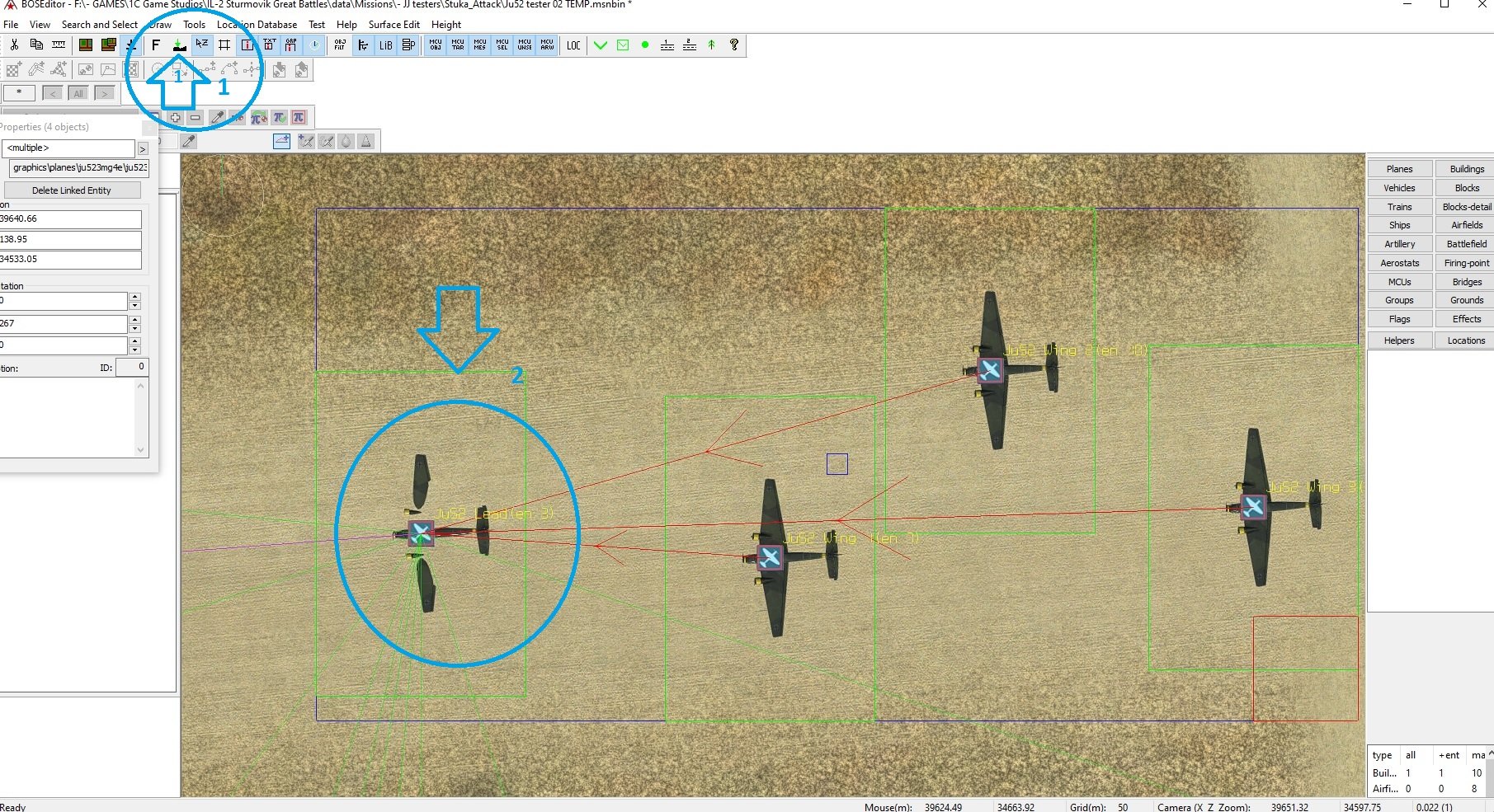 Beebop Posted January 14, 2020 Author Posted January 14, 2020 (edited) @Stoopy "is there a downstream waypoint after WP3 that may have gotten activated some other way? Is there a shared "Land" command back at the base they fly to, that is object linked to other aircraft that could have activated that command?" I don't think so. At this time I have three different flights going. A Ju-52 flight that takes off at player spawn and land s at a forward airfield. The Para Ju-52 flight that spawns at mission start, drops on the target city then returns to a further back airfield and the Stuka's which also spawn at mission start and after bombing (supposedly) return to yet a third rear airfield. Each flight has it's own, separate set of MCU's and waypoints. Each flight has it's own Land MCU. Nothing is shared. I have seen several posts on other subjects that say it's not a good idea for many of the type of reasons you mention. "how large is the Stuka's attack area? They're not flying out of it as they roll on their back, are they? " The Attack Area radius is 250 meters, just big enough to encompass a small artillery group of 5 guns (zis3), their hauler trucks (static zis truck) + 1 tank (t70), at the outskirts of town guarding the road into it while the Red Army is fleeing from it. (A large convoy with it's own MCU's and waypoints). Although I can't see them go outside the Attack Area radius during gameplay I would imagine they do go outside of it during the roll over. That wasn't a problem for the test group I used for a screenshot. As stated earlier I deliberately kept the Suka's Attack Area small so it doesn't overlap the Para drop Attack Area radius. But as pointed out earlier, overlapping radius's shouldn't matter. I will enlarge it and see what happens. "While the ME is known to be far from perfect... in my experience, every time I'm tempted to blame the tool I end up losing an opportunity to learn about a fixable problem I could have solved myself." Yeah you're probably right but I still wish the Dev's had done a better job of documenting the ME other than saying it was "powerful" as it is much more complex than the 46 FMB which Oleg did document and it was riddled with holes. Still a flawed document from them would be better than nothing. (I still think any owner who posts a workable solution for a game problem that's not a mod should get a discount on their next purchase). But for all that said I am far from giving up on this. I'll beat this problem if I have to use a stick! And with everyone's help. @jollyjack: Good find. Odd as I assume you set the terrain presets for summer as well as choosing the summer map. Is the mission date not a summer date? Could that have affected it? Also, in case that happens to someone else, (like me for instance), what file did you find that it? Another 'Thank You' to everyone who posts for continuing to assist. Without this help and encouragement I might have given up long ago. EDIT: Here's how it's currently laid out with enlarged Stuka Attack Area radius: Edited January 14, 2020 by Beebop