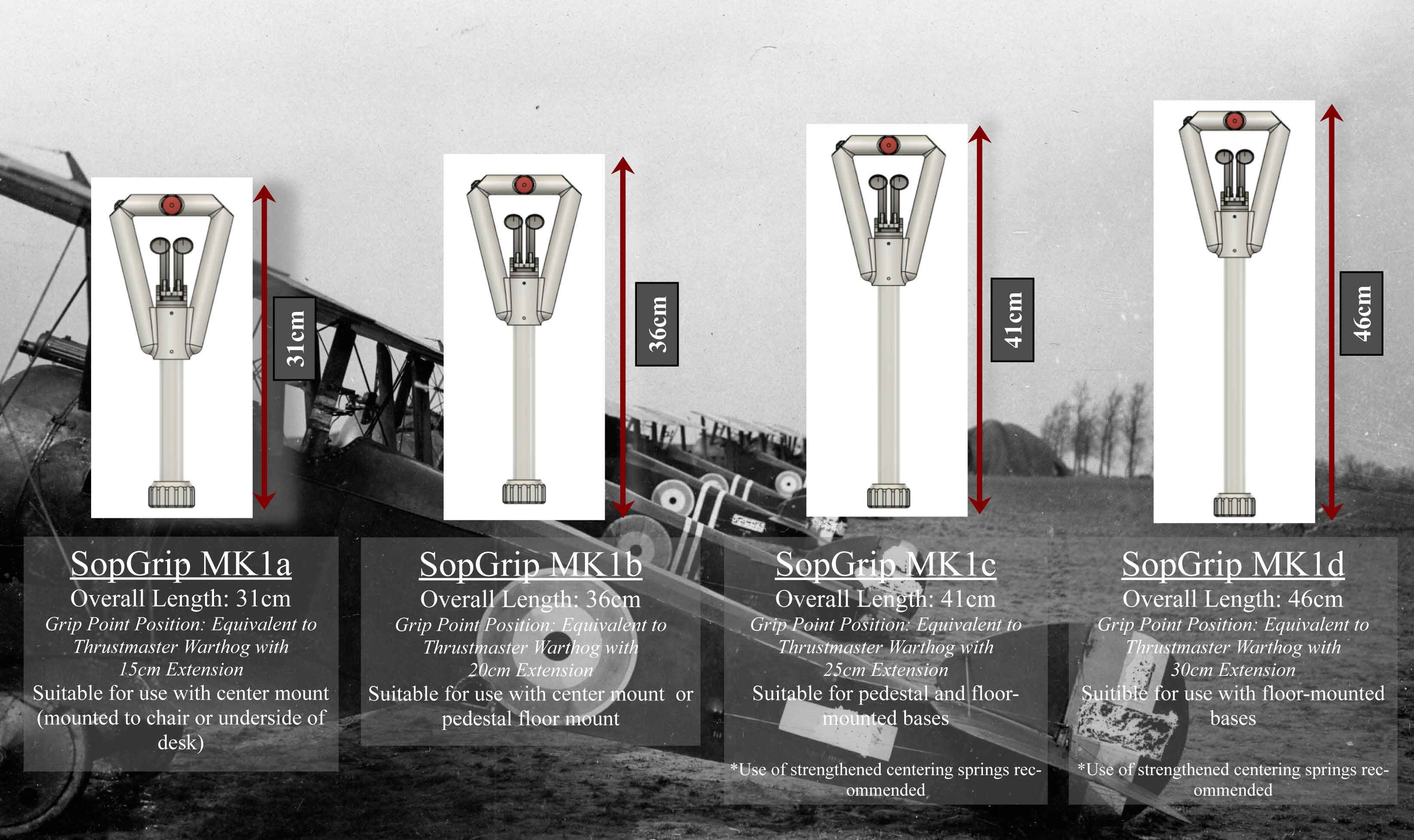 vonrickenbecker Posted January 11, 2020 Posted January 11, 2020 (edited) *Updated with new information and ordering instructions 4-16-2020* Greetings, fellow pilots! I am excited to announce the official release of the SopGrip MK1: An add-on joystick grip styled after the grip used in the Sopwith Camel, Dolphin, Pup, and others, with compatibility for Thrustmaster Warthog, Virpil Controls, VKB Gunfighter, and Microsoft Force-Feedback 2 bases! This grip is the culmination of nearly a year of painstaking development, working from original Sopwith Aviation blueprints for maximum historical accuracy. Extra buttons have been discretely added to enhance functionality (especially in VR) without compromising the authentic look and feel of the grip. Each grip is hand-made with strict attention to detail, providing an unparalleled level of immersion for WW1 flyers. As of today, grips are available for order! Ordering instructions can be found in the thread linked below. Read on for more details on this fantastic (if I do say so myself) addition to your simpit or simulator peripherals collection. Happy flying! To place an order for a SopGrip MK1, please see the instructions in the ordering thread, linked below. About the SopGrip Grip is compatible with Thrustmaster Warthog/Virpil style bases, and MSFFB2! An adapter for VKB Gunfighter bases is in the works and should be available in the near future. The grip utilizes a self-contained microcontroller with USB interface to your computer, eliminating the need for costly joystick-specific electrical adapter cables. Warthog base, luger, and bayonet not included Four standard lengths are available to accommodate a variety of simulator setups. Custom lengths available too! Unique cold-casting process utilizing a layer of real aluminum and steel gives resin castings a true metal finish: extremely durable and incredibly realistic! Authentic treated-cotton cord wrapping makes this grip feel just like the real thing in your hand. Use the replica “Blip” switch to control your rotary engine just like a real WW1 pilot. Two historically accurate individual triggers let you control weapon groups independently, or fire everything you’ve got! The discrete 4-Position Hat switch with center pushbutton gives the ability to program up to 5 extra commands to the stick. Every component of the SopGrip is constructed from tough and durable materials, including rigid polyurethane resin for the grip itself, 6061 aluminum tubing for the control column, a tough 3D-printed plastic for the joystick base adapters, and stainless-steel bolts and hardware throughout. Joystick mounted to TM Warthog/Virpil base has been stress-tested to an applied moment arm of 59 N-m. That means that with our mid-sized MK1b (36cm overall length), unit can withstand side loads of up to 16.9kg (37lb) of force! Want to know more about the development of this grip and future products that are in the works? Check out my development thread, linked below! Edited April 29, 2020 by vonrickenbecker 20 1