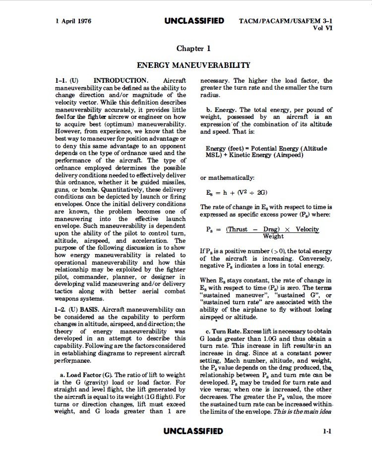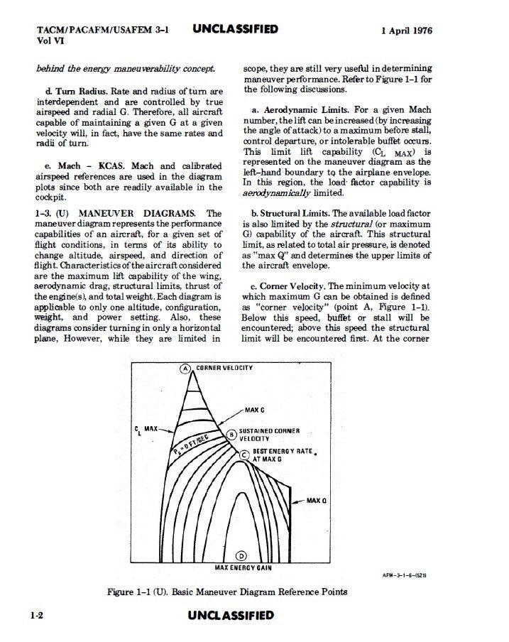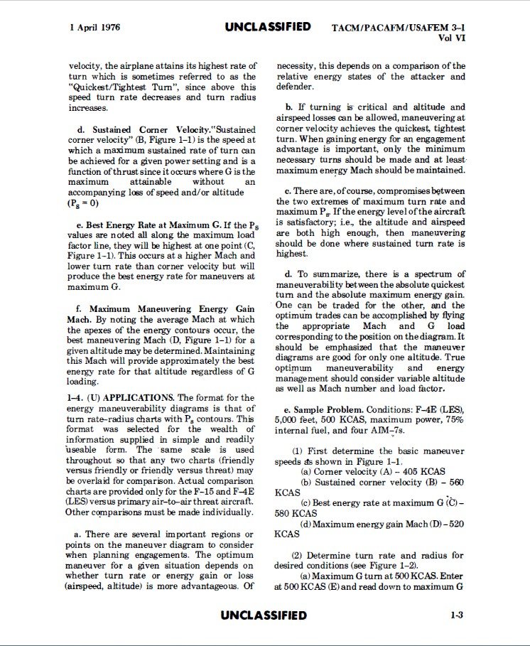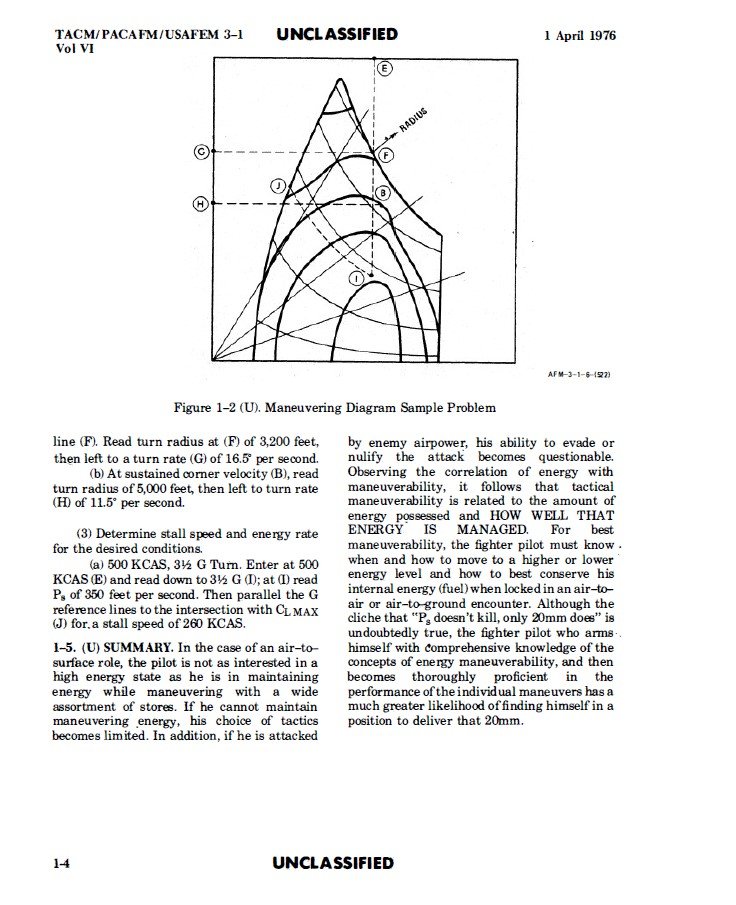 busdriver Posted October 3, 2021 Posted October 3, 2021 1 hour ago, Bremspropeller said: The airplane is supposed to be just about on par with a hard-wing F-4 at low altitudes (7g - give or take - sustained). I can absolutely agree with it's turn performance being on par with a hard-wing F-4. But neither could sustain a 7g turn. I've posted these images before, I just cleaned up the PDF pages, the charts still have the artifacts when I photocopied this in 1981. Even though the example uses an F-4E with LES, you can work out that the sustained corner velocity is way up there over 500 KCAS (>900 km/h) and the sustained turn radius is ~5000 feet (>1500 meters). I had a whole lot of unauthorized fun, flying low altitude 1-v-1 BFM with our fine friends from Canadaland that flew 104s from Sollingen. 1 2