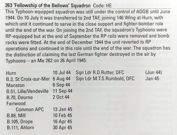 TP_Silk Posted July 28, 2020 Posted July 28, 2020 I recommend two books: Typhoon Wings of the 2nd TAF 1943-45 by Chris Thomas - Osprey Combat Aircraft series number 86 - ISBN 978 - 1 - 84603 - 973 - 7 Typhoon Attack by Norman Franks - Stackpole Military History Series - ISBN 978 - 0 - 8117 - 0643 - 8 And of course the 2TAF book that the earlier screenshots were taken from.
