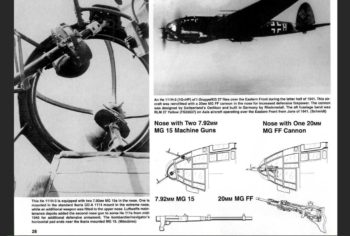 =KG76=flyus747 Posted June 1, 2020 Posted June 1, 2020 (edited) On 2/11/2020 at 12:01 PM, Geronimo553 said: Regarding the A-stand... This is the A stand on an H6 in IL2. You cannot really tell but I have it with the default MG15. Now this is the A-stand for (most likely an early) Heinkel. Look closely and you'll notice that the 'bulge' is more apparent on this gondola. This is the Ikaria GD-A 1114 aka the one that can rotate because the gun mount area looks just like the one in your video. This Ikaria gondola is mentioned numerous times in the book He-111 in Action by George Punka. I've included few segments from that book to illustrate my point. Now look at this gondola. I don't know the name of this gondola, however, we can deduce that this is most likely a later variant of the Heinkel since the engine instruments can be see on the right side of the pilot like in the H16. Now, compare this gondola to the Ikaria GD-A 1114, you'll notice this one is not protruding as much. There is also two "flaps" on both sides of the mount. This particular mount is also much bigger (prob since this was the gondola meant for the MG FF). This is the variant that does NOT ROTATE. The MG FF, as we know, fires a heavier 20mm round and also has a lot more recoil. The amount of recoil necessitated that the gondola be bolted down hence why the He111 eventually had two different gondolas. It should be noted that I have also seen photos of this later version gondola attached with an MG131 13mm machine gun. Despite the H6 being defaulted with a MG 15, the developers chose to only make 1 gondola version (you can guess which, and I am going to assume this shortcut) was done to save time and resource. In short, the ingame version isn't necessarily "inaccurate" because that later version of the gondola could not rotate and the devs just chose to use that one even for the tiny MG 15. In short, the Ikaria GD-A 1114 will be best identified from the inside for having the handles from which to rotate the ball. The later variant is identified for its LACK of this feature and also having a far more pronounced "square" mount. Here is a view of the gondola from the inside that can be found from the most unlikeliest of sources: The Chronicles of Narnia (opening scene) Edited June 8, 2020 by HE111H6ismissingtailMG17 wording 2