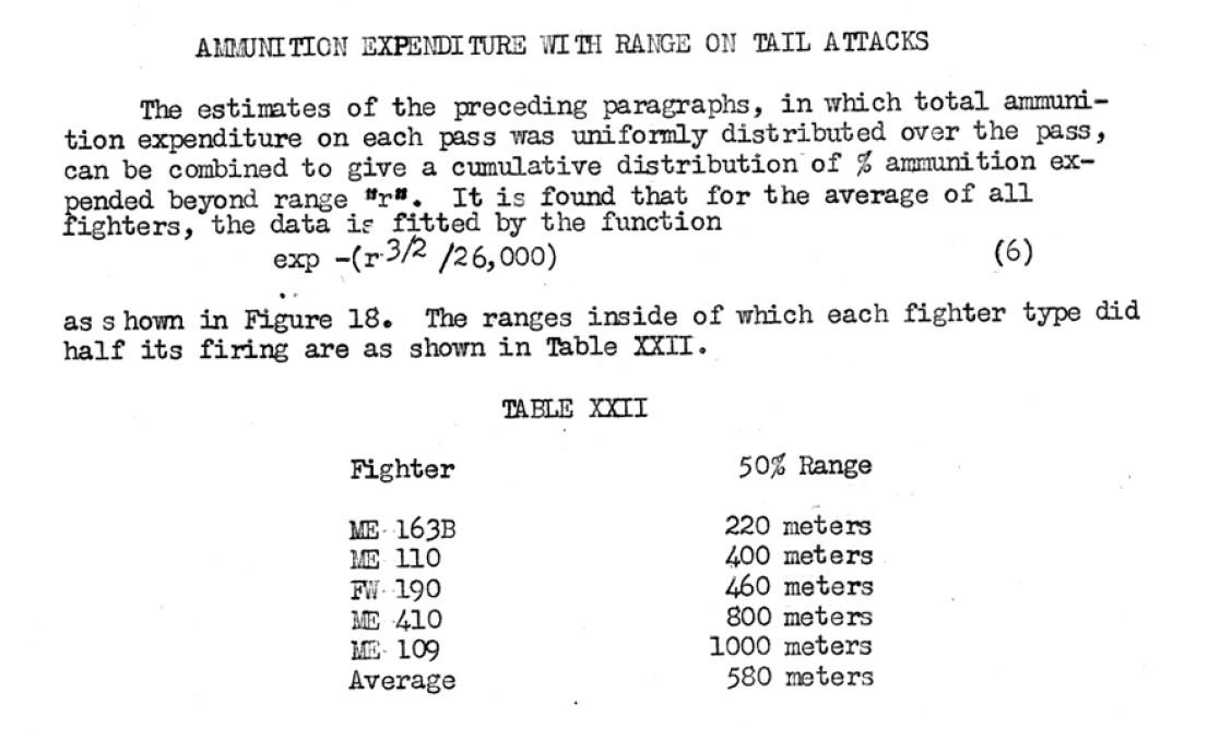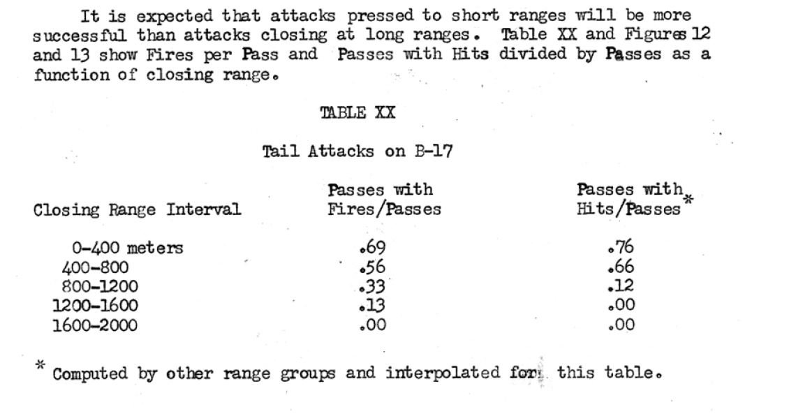 unreasonable Posted February 15, 2020 Posted February 15, 2020 (edited) 8 hours ago, Eisenfaustus said: At 400m attacks seldom did anything other than warn a victim of the attackers presence... Very very few - even of the top aces - were able to sucessfully kill a flying airplane at 400m... Attacking bombers from 1km away was completely useless - and how do you suppress a tailgunner? He has nowhere to, nowhere to hide - his only chance of survival is to shoot back... You might spoil his aim a little - but the defensive fire will suppress the fighter. He might dodge and abort the attack, loose his nerve and stall the plane or do something stupid like wasting ammo at 1km and having run out of it when in relevent distance (for a huge four engined bomber something like 300m) Attacking Bombers with effective gunner sfrom behind is dangerous and thus was evaded when possible... right angle is not a decent attack position - at anything more than 30° ai's main concern should be maneuvering to a better position instead of leading ther target No-one disputes that results from close attacks were much more likely to be successful, but the reality is that the majority of attacks started at long range. Opening fire at very short range is only practical when you can sneak up on an unaware target or he is helpless for some other reason. If it were possible to program AI so that it could discriminate tactically and vary opening range accordingly, your very short range ace AI proposal might be useful. As a blanket suggestion it is impractical and ahistoric. US analysis of German gun cameras (BLR report 727) shows that the average distance at which fighters opened fire at Spitfires in 1942 was 500m. For all target attacks the median battle distance was 260m (that is the average of opening fire and breaking off). In 1943-44 the median battle distance for all targets (by then mostly bombers) was 980m, so German fighters were usually opening fire at long range. Long range attacks were not useless: see in this table that even at 1200-1600m range 13% of passes in this case started fires. Note that some hits (especially AP) are not observable at long range on the films. While your single shot hit probability is very low, German fighters by the late war - especially Fw190s - carried a lot of guns and a large ammo load. They were not looking to conserve ammo to make some absurd "ace in a flight" MP video. You suppress an enemy gunner by killing him, and the longer you fire at the target the better chance you have of doing so, especially since the fighters often had poor tracking accuracy and needed tracers and time to make adjustments to get on target. Attacking bombers from the rear hemisphere was the most common attack pattern, about twice as frequent as from the front, also about twice as successful. See report for details. Close to a right angle is sometimes the optimum attack angle: against IL-2s for instance, as it exposes the cockpit area, including fuel tanks. 3 hours ago, Ram399 said: I've been able to get the AI to do this by acting as flight leader and positioning my flight in the path of the bombers, but they only hit the bombers very rarely- and after the initial run they continue on with standard attacks straight onto the bombers 6, generally getting torn up by gunners in the process. As far as engagement ranges for bombers go historically, these guncam videos are a great resource- just be advised some of them are a bit graphic. I have had the same problem. The films show a variety of ranges and angles, but one must also bear in mind that they have been selected for "entertainment" purposes: I think the report gives a clear analysis of the overall picture. Downloadable here: https://www.deutscheluftwaffe.com/archiv/Dokumente/ABC/a/Alliierte/US Air Combat Records WW II.pdf Edited February 15, 2020 by unreasonable 1 2