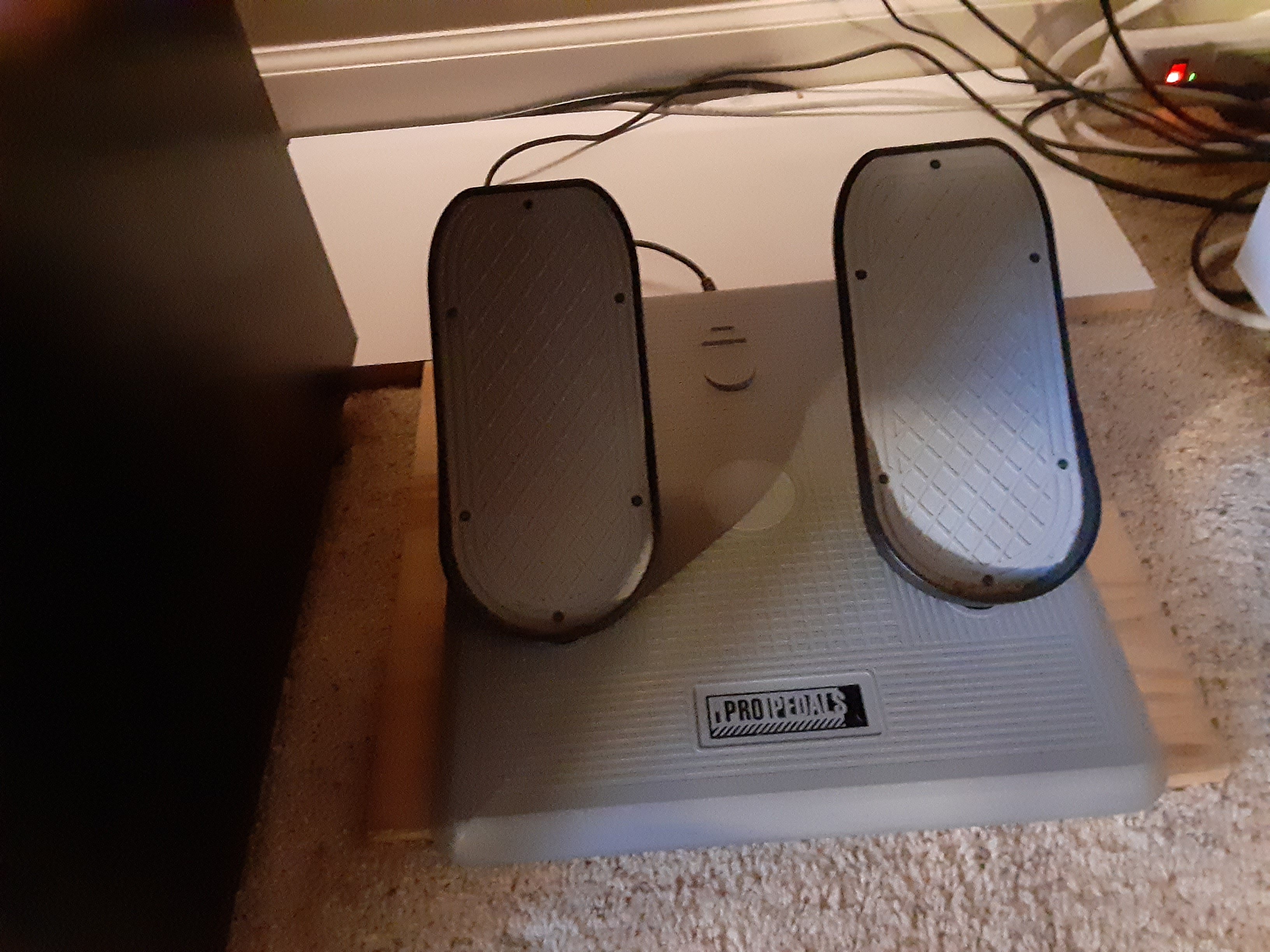 Vig Posted February 14, 2020 Posted February 14, 2020 Elegant solution, and nice carpet btw! If my wife sees that we will get the new floors she has been mentioning on and off for the past several years! Many years ago, having the same problem, I went out in the garage and made a brace to keep my CH Pedals from sliding and shorting out the USB cable. Brackets hold CH pedals to a wooden base, wooden base rests flush against a piece of scrap shelving, which in turn rests against the baseboard. Rock solid. As installed: