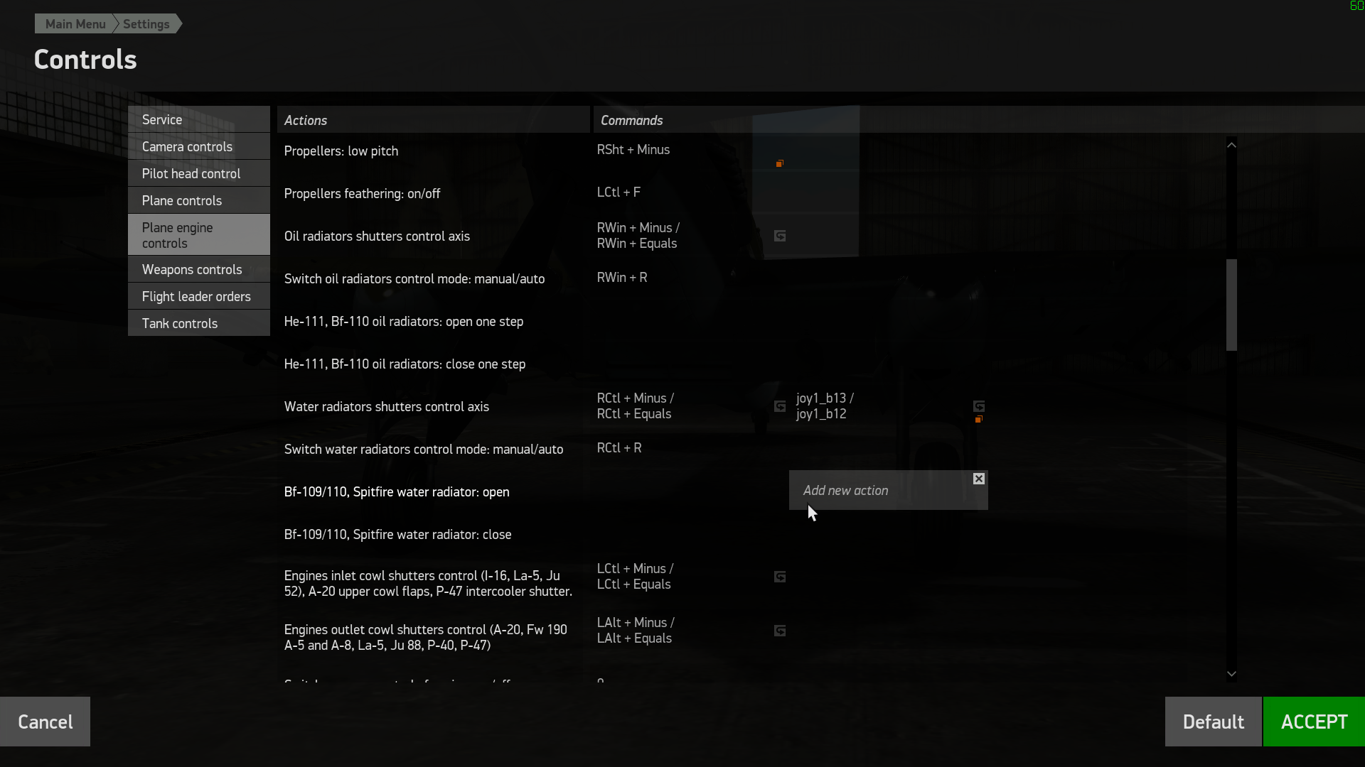THERION Posted March 16, 2020 Posted March 16, 2020 14 minutes ago, CaptainCernick said: Hey everyone, The keybinds for the radiators don't seem to have an effect. They are still bound to the default key combinations (RWIN / RCTR -/+), but pressing them has no effect on the Il-2 model 1943 (my test platform until now). I also tried binding them to the toggle switches on the X52 joystick, still no effect. I'm quite sure this is due to user error, I just can't find out what I've been doing wrong for the past two days. All engine aids are disabled in the difficulty screen. Interestingly, using the water radiator control for the spit mkv (a separate control bind in the menu) is working fine. Looking forward to hearing from you! Be aware that there were some changes in the key binding settings, especially for flaps and gear, but also stab/elevator trimmers. Originally most of them were toggle functions. Now, you have to buttons to assign. Not 100% sure about radiator controls, but it might be the same. Here a screen shot to give you an idea: For radiator controls just look into "Plane engine controls" category. Cheerio