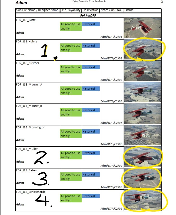 J5_Adam Posted April 21, 2020 Author Posted April 21, 2020 3 hours ago, GCF said: Final FCUSB chapter 2 update to here. Please Check i have them all good. Thanks for doing this hard work. I found a couple small errors in your thumbnails. I'll outline them and send them to you for your perusal. Hi GCF, First thing I saw and maybe of no concern. You have in your "Notes and USB Number" column that all these skins are the DVII "F". Only 1 is actually a DVIIF (D7F_J17_Unmarked) All the rest are just the regular DVII. The thumbnails: I've circled and marked 4 or them and numbered them 1-4. #1 Has the wrong picture associated with the file name. it should look like this for Kuhne #2 Has the wrong picture associated with the file name. it should look like this for Muller #3 Has the wrong picture associated with the file name. it should look like this for Raben #4 Has the wrong picture associated with the file name. it should look like this for Schleichardt THANKS AGAIN FOR YOUR HARD WORK!! 1