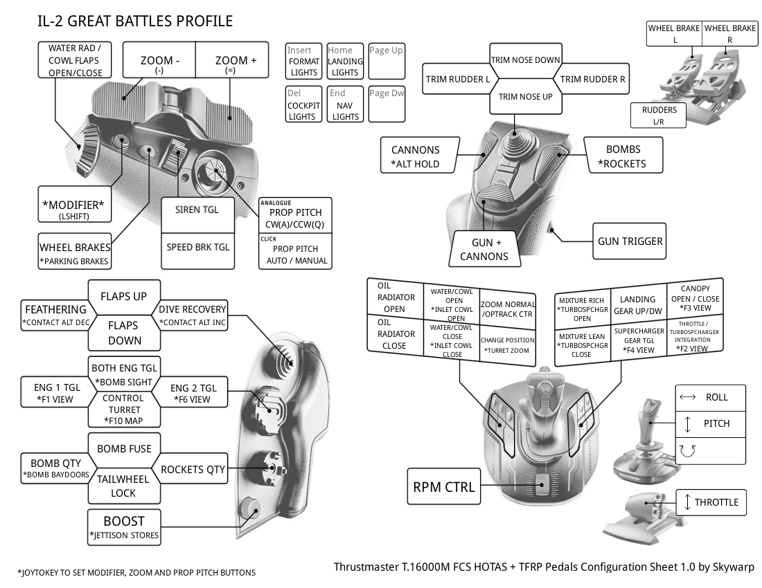 Skywarp Posted April 11, 2020 Posted April 11, 2020 (edited) I made this profile for my T.16000M FCS & TFRP Pedals. P.S.: This profile assumes you have a Headtracker. I downloaded JoytoKey and: Keyboard key LShift Function was binded as the modifier button Keyboard keys = and - were binded for Zoom + and - Keyboard keys A and Q were binded for Prop Pitch CW and CCW https://joytokey.net/en/download I also use some keyboard keys as support for cockpit and external lights. Edited January 6, 2022 by Skywarp