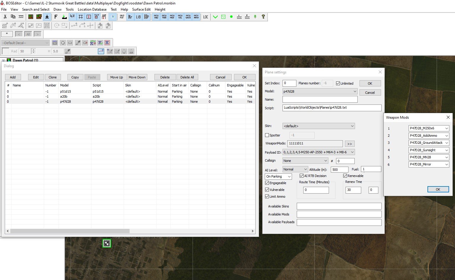 352ndRoodster Posted April 10, 2020 Posted April 10, 2020 G`day Guys, I am building a new mission and as such I want to restrict the weapon loadout on the P-47. I am trying to work out what the numbers mean in "Weapon Mods" & "Payload ID" in the ME and how to restrict the bombs to only 500lb yet still allowing other options as well ie Additional Ammo and Rockets. I have tried researching through the Mission Editor guide from Jim as well as searching this forum with other mission authors encountering the same problem but with no success. I have also come across "Smoke Gen White one -1", "Smoke Gen Blue one -1" in the "Payload ID" section but have no idea what these mean..??? ? Any assistance is greatly appreciated. I have attached the mission files for your perusal.. Cheers Roodster Dawn Patrol.zip