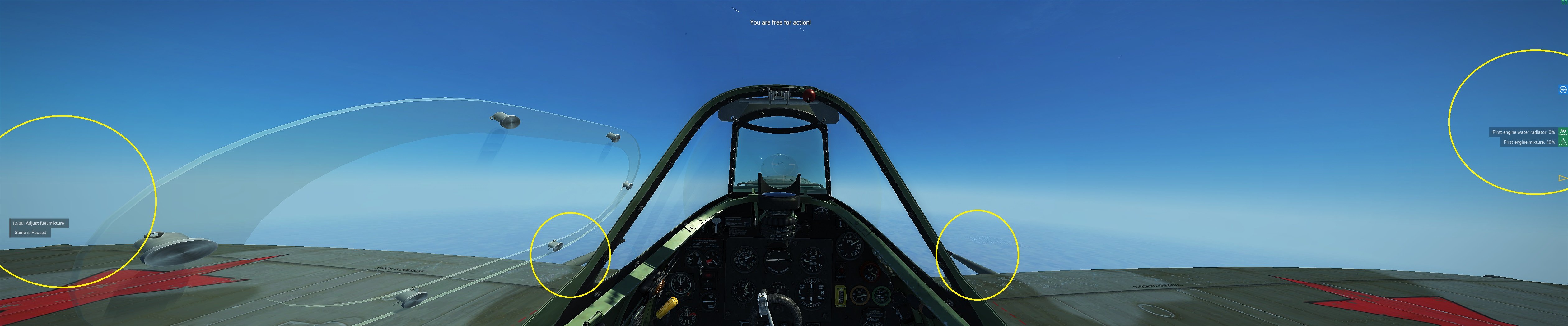 315_R2r Posted April 27, 2020 Posted April 27, 2020 Hi all, in the past I did play old Il2 with 3 monitors setup... Recently I have start playing new Il2 BOS (Great Battles) - and now I connected the 3 monitors back. I know that topic was active in 2015 etc... But I did not find any suitable solution for my problems. It works on 3 screens due to NVidia Surround option. I run it in resolution 5040x1050 I have 3 following problems: 1. FOV and fish eye effect - see screenshot - the wings are stretched, but it is general issue - see the one from menu and point 3. 2. Menu, chat and user interface - optimal would be to have it in the middle monitor, adjustable in position (I know, I may ask for to much) 3. Bomb sight view - without any adjustable FOV it is truncated. I would appreciate the solution without usage of mods since not so many multiplayer servers allows mods. On screenshots I mark with yellow the most annoying options. I just wonder how the hell any other users with HiRes Wide screens can solve it or play Regards
