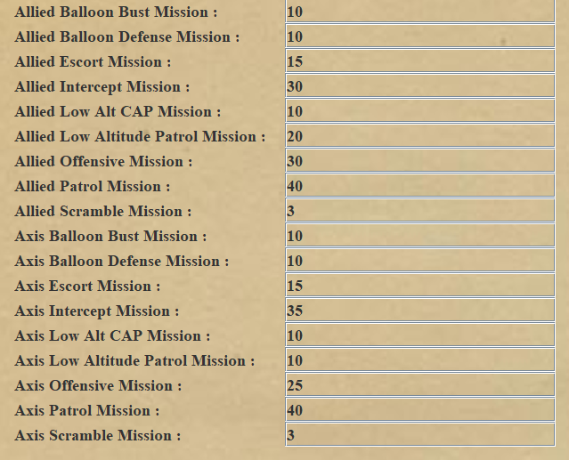 Kur12 Posted December 22, 2020 Posted December 22, 2020 (edited) Patrick, the setting is not working properly: Configuration - Advanced Config - Fighter Mission Type First there were the default settings: With default settings I created 30 missions and counted them. Out of 30, 9 Ground Attack missions and 4 INTERCEPT missions turned out (43%) I really don't like the Ground Attack and INTERCEPT missions, so I changed the settings like this: Then I created 30 missions again. Out of 30, 6 Ground Attack missions and 6 INTERCEPT missions turned out (40%). Those. actually nothing has changed! It turns out that this setting is not involved at all when creating a mission. Edited December 22, 2020 by Kur12