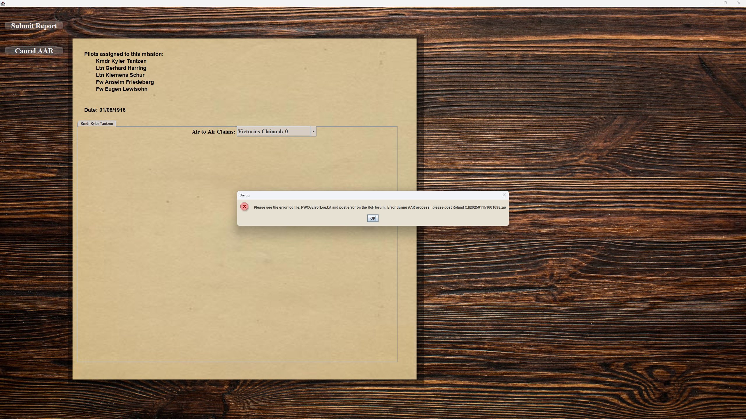 KodiakJac Posted January 15 Posted January 15 (edited) Problems with Roland C.IIa Hi Pat, I've tried to start two different campaigns with the Roland C.IIa in v17.1.0 In the first Roland campaign I tried with Schlasta 2 starting on Aug 1, 1916 I got an error message when trying to complete the AAR that said something about a Nieuport 17. I've attached "Roland C.IIa202501150201932.zip for it, but didn't fully document it. Then I tried a new Roland campaign with Schlasta 10 and got a different error message when trying to complete the AAR. I've attached all documents for it per the error message, including a jpg of the error message. Also, Schlasta 10 can't take-off at Bellevue Ferme (where it is stationed on Aug 1, 1916) because the take-off roll is too short before reaching a hill at the end of the runway. So, I moved to the next nearest airfield "Hivry Circourt" where I could take off. But after a successful mission I got the AAR error message below. In the PWCGErrorLog.txt there are a lot of "Invalid aircraft: rolc2a" comments, which is the old name for the newly named "rolandc2a" in PWCG. The rolc2a is not in my planes owned list, so it is coming from somewhere else in PWCG. Also, you can't start a Roland campaign on July 1, 1916 when it becomes available. It's listed on the Schlasta pick list, but when you try to complete the campaign creation process, you get an error message saying something about the Nieuport 17. Thanks for your help with this. The Roland is one of my favorite 2 seaters because it is so ugly...lol 🙂 Roland C.IIa202501150201932.zip PWCGErrorLog.txt Roland C.II202501151601698.zip Edited January 17 by KodiakJac