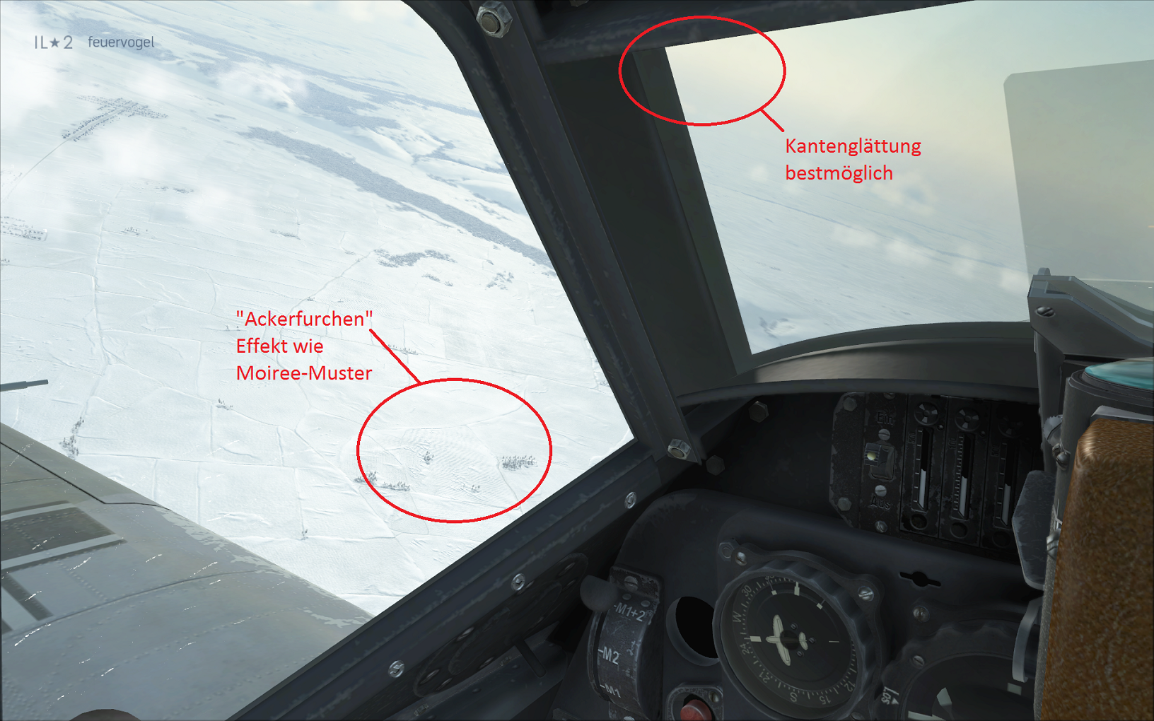 feuervogel Posted May 4, 2014 Posted May 4, 2014 (edited) ... in bestimmten Bereichen flimmernde bzw. flackernde Texturen beobachten. Bei den betroffenen Flächen handelt es sich vor allem um baumbestandene Flächen und Ackerflächen, die eine bestimmte Struktur aufweisen (Ackerfurchen). Zu sehen ist das Flimmern aus bestimmten Blickwinkeln und bestimmten Entfernungen. Komme ich den Flächen näher oder verändert sich der Winkel zu ihnen, verschwindet das Flimmern. Hallo ram, ich kann dieses Flimmern bei den Ackerfurchen bestätigen, abhängig vom Blickwinkel bzw. Sonnenstand entsteht ein Schimmern ähnlich einem Moiré-Effekt. Bei den Waldflächen und Dörfern habe ich diesen Effekt jedoch nicht, abgesehen vom Schimmern der Straßen und Wege aus bestimmten Blickwinkeln (in Rise Of Flight in Riesenproblem), in BOS glücklicherweise nicht so ausgeprägt. Ich habe auch mal einen Screenshot gemacht, da mir auf Deinem Pic auch der Treppcheneffekt an den Außenlinien der Rahmen der Kanzel oder Flügelvorderkante aufgefallen ist. AA_Moiree_ingame.bmp Wenn das auch im Spiel so aussieht könnte Dir evtl. der NVidia Inspector weiterhelfen (Kennst Du den schon?). Ich nutze folgende Settings: Hier habe ich durch SparseGridSS ganz gute Ergebnisse erzielen können, Deine Graka sollte auch 4x stemmen können. Das SweetFX habe ich noch ausprobiert. Meine Grafikeinstellung ingame sind "Ultra": Auflösung:: 1920 x 1200 Vollbild: angehakt Vsync: dto. FPS Limiter: 60 AA: 4 Gamma: 1 Meine Graka ist eine GTX580 Ich hoffe Dir ein wenig geholfen zu haben und wünsche Dir ein zufriedenstellendes Ergebnis beim Testen. Horrido! Edited May 4, 2014 by feuervogel 1