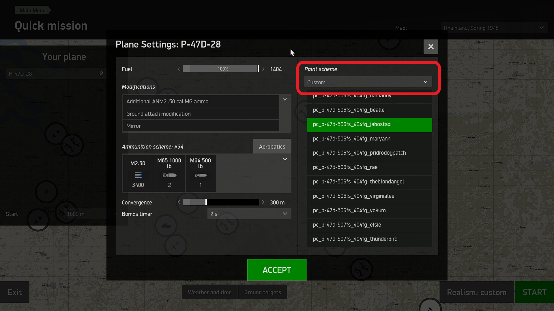 THERION Posted May 6, 2020 Posted May 6, 2020 (edited) 1 hour ago, duff_tavern said: Therion, Thank you for the welcome and thanks for your quick response. I put the skins in the "data\graphics\skins" folder but they do not show up in the game. BTW, I have the stand alone version. I must be doing something wrong. Well, the only thing that comes up in my mind is, that you probably stored them in the right place, but you didn't change the drop-down selection Paint schemes from "Official" to "Custom" where you select your weapons configuration etc.? Here a screenshot to document: Cheers Edited May 6, 2020 by -=-THERION 1