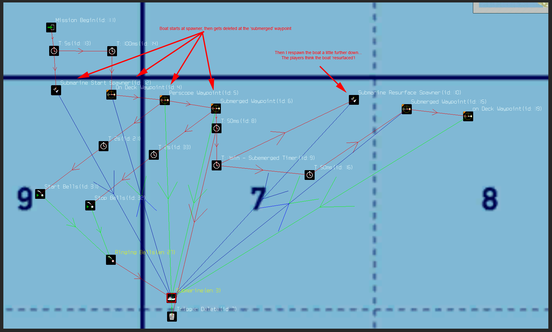 Sketch Posted May 8, 2020 Posted May 8, 2020 (edited) I can answer some of this... 37 minutes ago, Beebop said: I am trying to construct a Wolfpack attacking a convoy mission. * Can I have the subs decks awash? I tried '-1' for the waypoints "Y" value since you can't set a depth below 0 for the sub itself. They still stayed at sea level. * Can I have them submerged? If they are submerged are they susceptible to bombs? (or torpedoes if flying Axis planes with the Torpedo Mod)? 1) The subs should go to periscope depth when the waypoint is set to a negative value. 2) You can't technically have the boats submerged... But with a little bit of trickery, you can make it appear like they've submerged. In my example below, I delete the boats once they get to a certain waypoint. Then, I wait for X amount of time (that's the time the boats will be submerged), and after the timer is complete I respawn the boats in a new area. Players can't tell or don't care to tell the difference. 37 minutes ago, Beebop said: Each flotilla was using a Command Formation. What would happen if I set some of the ships to 'Low' priority so there might be different rates of fire amongst the ships of the flotilla? Would it screw up the formation? I normally don't use formations with boats. They seem, to me at least, to not follow good formation discipline and tend to get stuck amongst each other. So I instead just use individual waypoints, and if things don't behave the way I want it too, I adjust the singular waypoints for that ship that's causing problems. (Normally, by moving the waypoint away from other waypoints.) 37 minutes ago, Beebop said: And when the battle started to wind down... Whisky Tango Foxtrot is this? (Destroyer was Target Linked to Convoy Leader who was sunk None of the other cargo/tankers reversed direction) Probably because the enemy sub was too low for it's deck guns, so it's trying to get a better position to shoot. Then again, who knows. I'll make a simple sub attack mission this weekend, if I get a chance. Then you can use it to build upon. Edited May 8, 2020 by Sketch