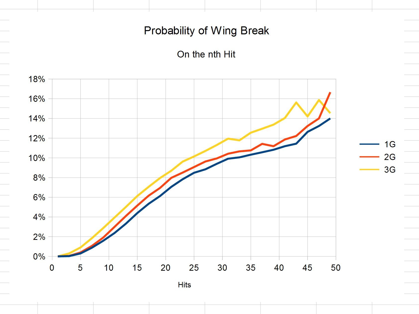 unreasonable Posted May 25, 2020 Posted May 25, 2020 (edited) 1 hour ago, US93_Larner said: [snip] In all honesty - I've more recently been thinking that this is largely a consequence of how the wing damage is calculated - I.E, a % modifier on chance to hit a spar based on the angle of shot. I think that, especially in the case of WW1 aircraft, the spars need to have a physical hit-box. After all, we all know that most hits on a wing would pass through the canvas and most likely miss any vitals of the wing structure. I also wonder if any extra considerations for the D.VII cantilever box spars, and other aircraft with two sets of spars, were made? But - I appreciate that there are circumstances that are deterring the devs from more accurately modelling the wings, and if this is what we get then this is what we get. This would only solidify my opinion that WW1 wing damage needs to be modelled in greater detail... But - I appreciate that there are circumstances that are deterring the devs from more accurately modelling the wings, and if this is what we get then this is what we get. In the long run, it should make no difference to the DM whether there is a spar hit box or a % chance to hit a spar based on spar/wing area ratios for a given angle, assuming the ratios are correct. The number of "spar" hits should be identical. It is just easier to run a real time DM with fewer hit boxes and more probability tables, according to AnP. The damage model is already pretty sophisticated, as you can see by looking at AnP's Camel Behind graph. So I am not sure what more "accuracy" you want. It seems that you just want different results. Taking the data points from the Camel's behind and reworking them, you can express them like this. You can see that each hit has a higher probability of breaking the wing than the one before, but it is not just a matter of running out of Hit-points. So for instance if you are at 1G and have taken 20 hits in a wing section, the probability of the next hit breaking that section is ~ 7% The lines get wonky at the end because I am estimating small numbers off a graph, and did not bother to smooth them. PS - when you get to 4G and 5G lines there appears to be something additional going on, as the distribution is not regular, so I left them out. Edited May 25, 2020 by unreasonable 1
