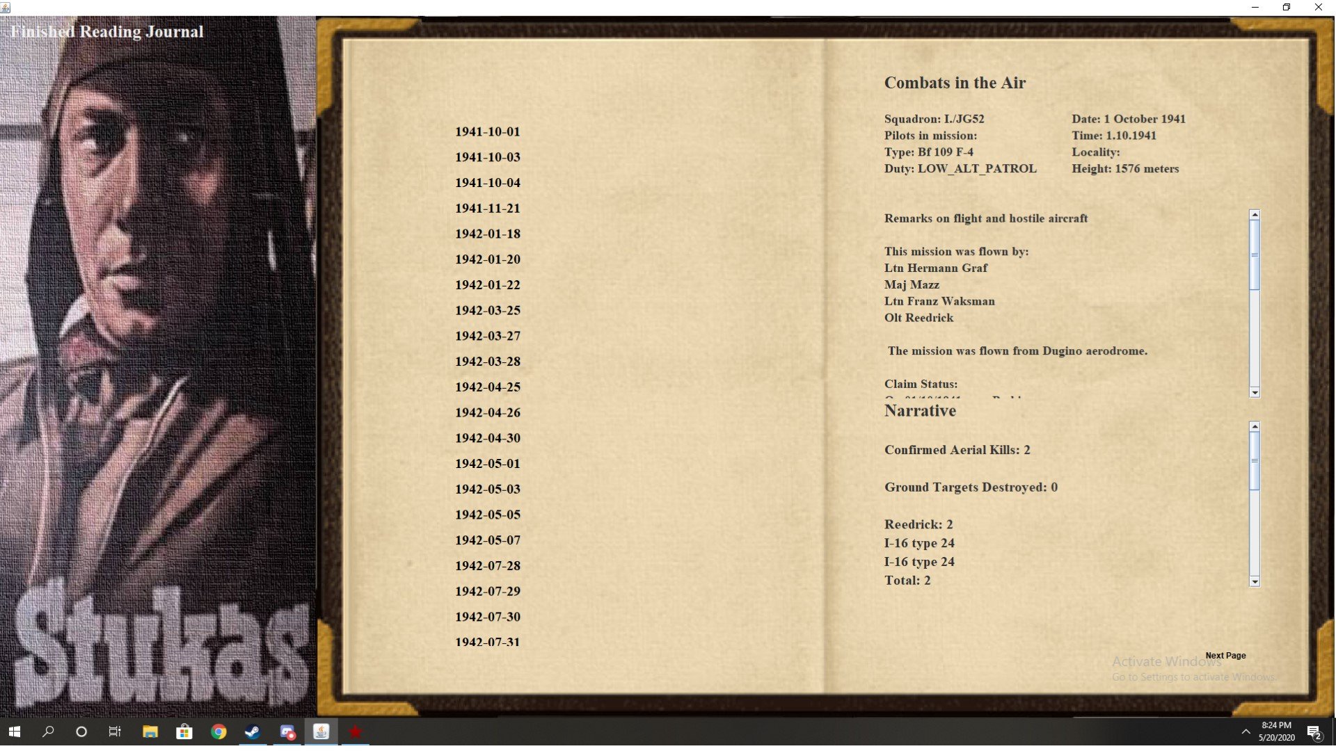 -332FG-Reedrick Posted May 21, 2020 Posted May 21, 2020 (edited) Curious if this is a bug, or if I'm missing something here. I keep logs of me and all my buddies kills through the Narratives in the journal since the kill claiming wasn't always working 100% until recently (knock on wood). However once I reached a certain amount of dates they stop showing on the left hand side and I'm not able to scroll down to the latest date. I have to pick the date that is furthest down on the journal and then hit the next page at the bottom right to get to the most recent entry. Is something wrong on my end or ?? As you can see in the pictures the last date I'm able to choose the front page of the journal is July 31, 1942. Yet my most recent entry is Dec. 15, 1942 (which I have to click Next page from July 31 to get to). And no I will not activate windows! ? Edited May 21, 2020 by Reedrick