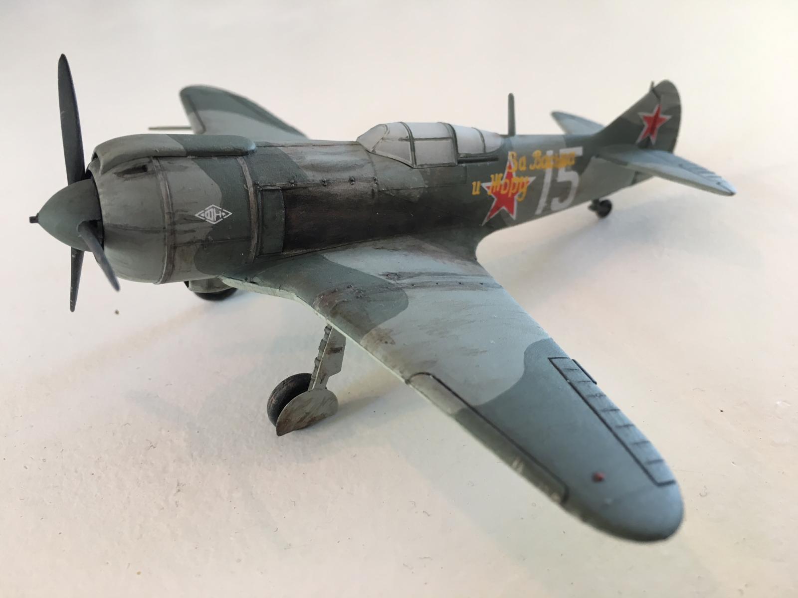 Finkeren Posted September 24, 2017 Posted September 24, 2017 Very nice Feathered. That's a hard act to follow, but as per your request, I finished Galchenko's LaGG-3 s. 3. I was just about to ruin the whole thing once again, as I was sawing off the sliding portion of the canopy (which was removed from Galchenko's aircraft at this point in time) the whole thing splintered, including parts of the windscreen. However, I managed to patch it up and got the model completed. There is still a bit I need to brush up, but just in case I screw up with the filler, I want to share the pictures beforehand. There are so many weird details on this aircraft: The gradual overpainting of all markings except the cat (this one still has the number and the stars under the wings) The slightly crooked, hand-painted red star on the spinner The strange lines painted over the left rear window (absolutely no idea what they are, but they appear clear as day in the photographic evidence) I still like the overall color scheme Notice the small size and weird placement of the underwing stars Overall I'm mostly satisfied with my first successfully finished built in 20 years. Next project is going to be my all-time favorite: The MiG-3. 5