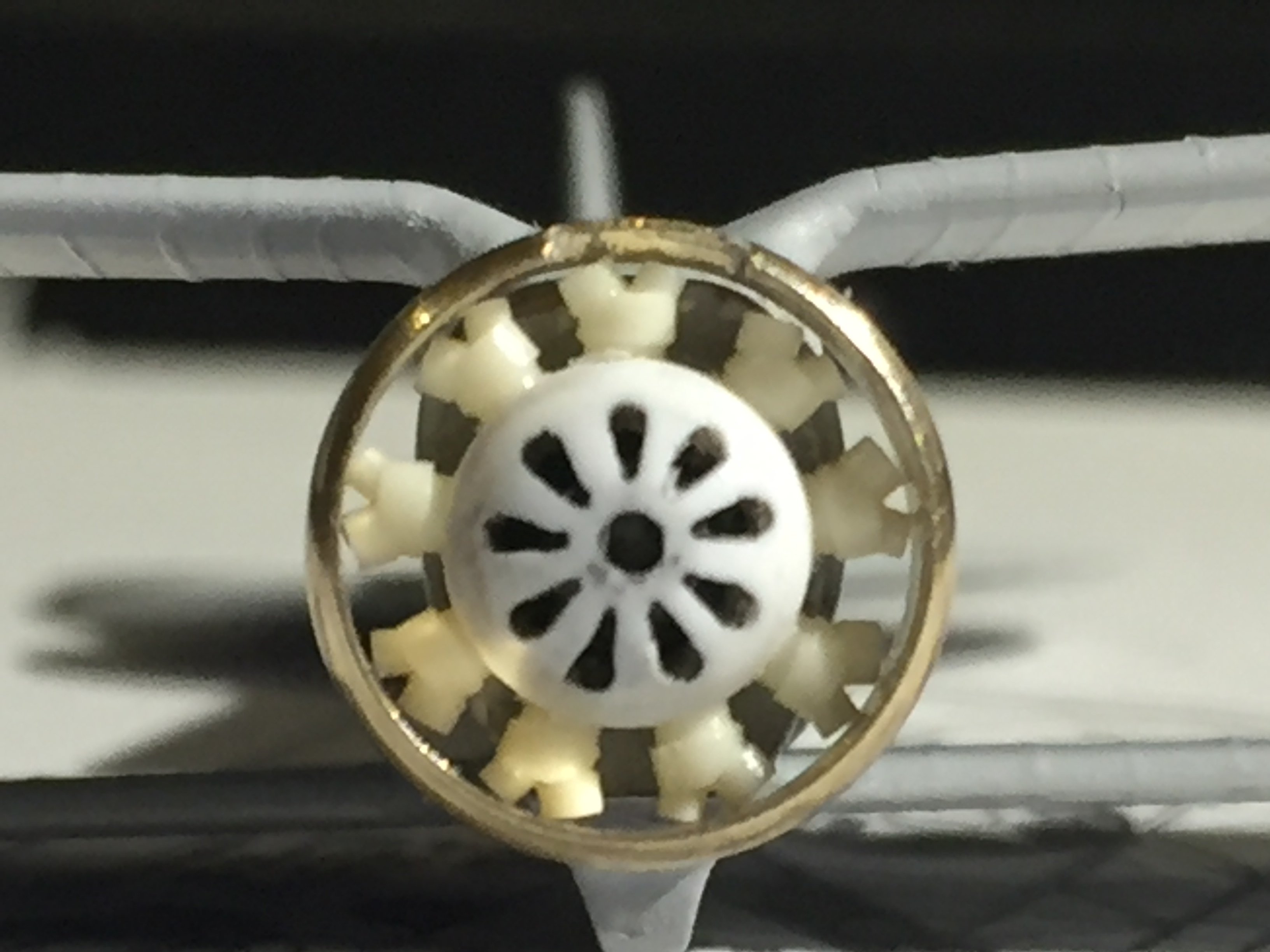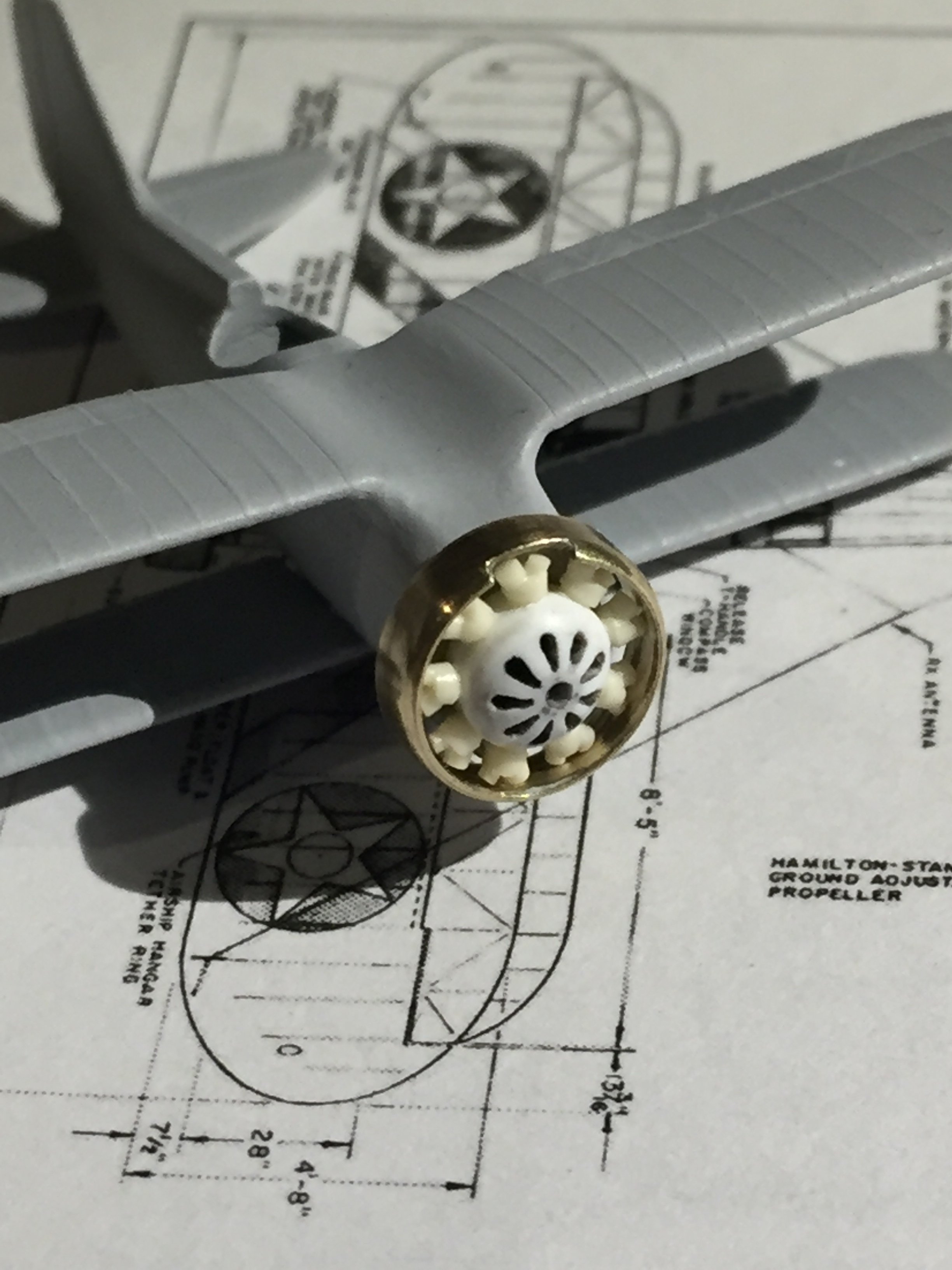 Feathered_IV Posted September 14, 2019 Posted September 14, 2019 Got a few more hours in and made the Sparrowhawk's Wright 9-cylinder engine to the point where I can dry fit the parts together. The central boss was turned up out of a solid disk of 3mm styrene. After that I made a 9-segment setout in photoshop and printed it out. This was stuck to the remaining styrene sheet and a .7mm hole drilled precisely at its centre. A bit of rod was jammed up the hub's backside and pushed into the hole at the centre of the template. I made sure it was firm but rotated smoothly. I measured one of the segments of the wedge shaped cutouts and scored this on another bit of plastic that was positioned over the hub and secured with bulldog clips. Pretty rough, but it did the job. Using a sharpened needle, I was able to use the guide to mark the top and bottom of each cutout with a little countersunk mark. After each one, the hub was rotated and the action repeated. After doing each segment I could then take the hub off the template and drill a hole at each end. A .2mm hole at the inner, and a .5mm at the outer edge. After that a fresh scalpel blade was used to "join the dots" and cut a Vee out of the plastic between each pair of holes. The needle was used to dig some of the plastic out too, and was often used to burnish the edges into shape. The resultant hub is pretty tiny. Only about 4.8mm across. I may go back later and fuss over it a bit more, but that will do for now. A master was made for one of the cylinders then cast. The R-975 engine has offset "branching" cylinder heads so I used a couple of different diameter rods to achieve this. It's pretty small, but you do notice it. The hub was drilled around the outside so the cylinders could be pushed in for a bit of a test fit and photo opportunity. The brass cowling is the one I made 22 years ago and still hope to retain. Pretty much for nostalgia if nothing else! 5 2