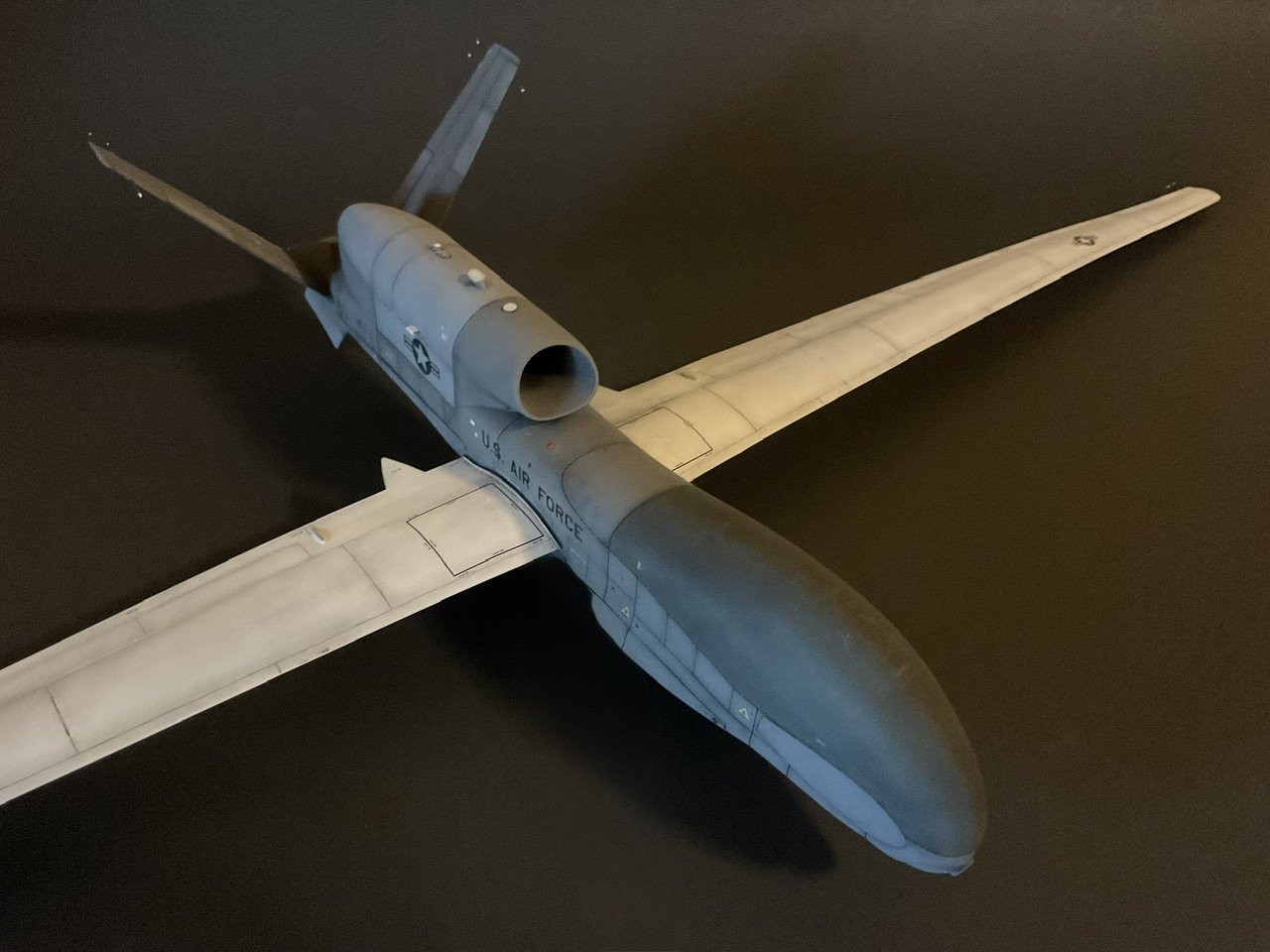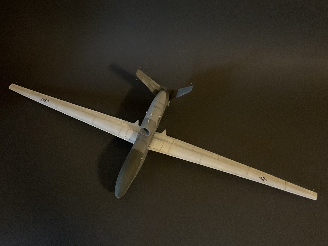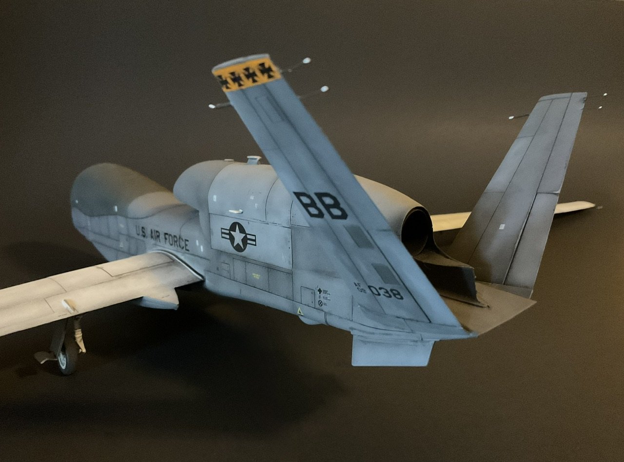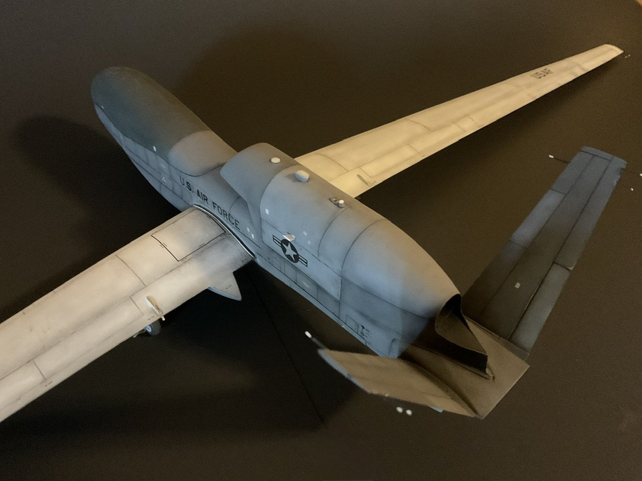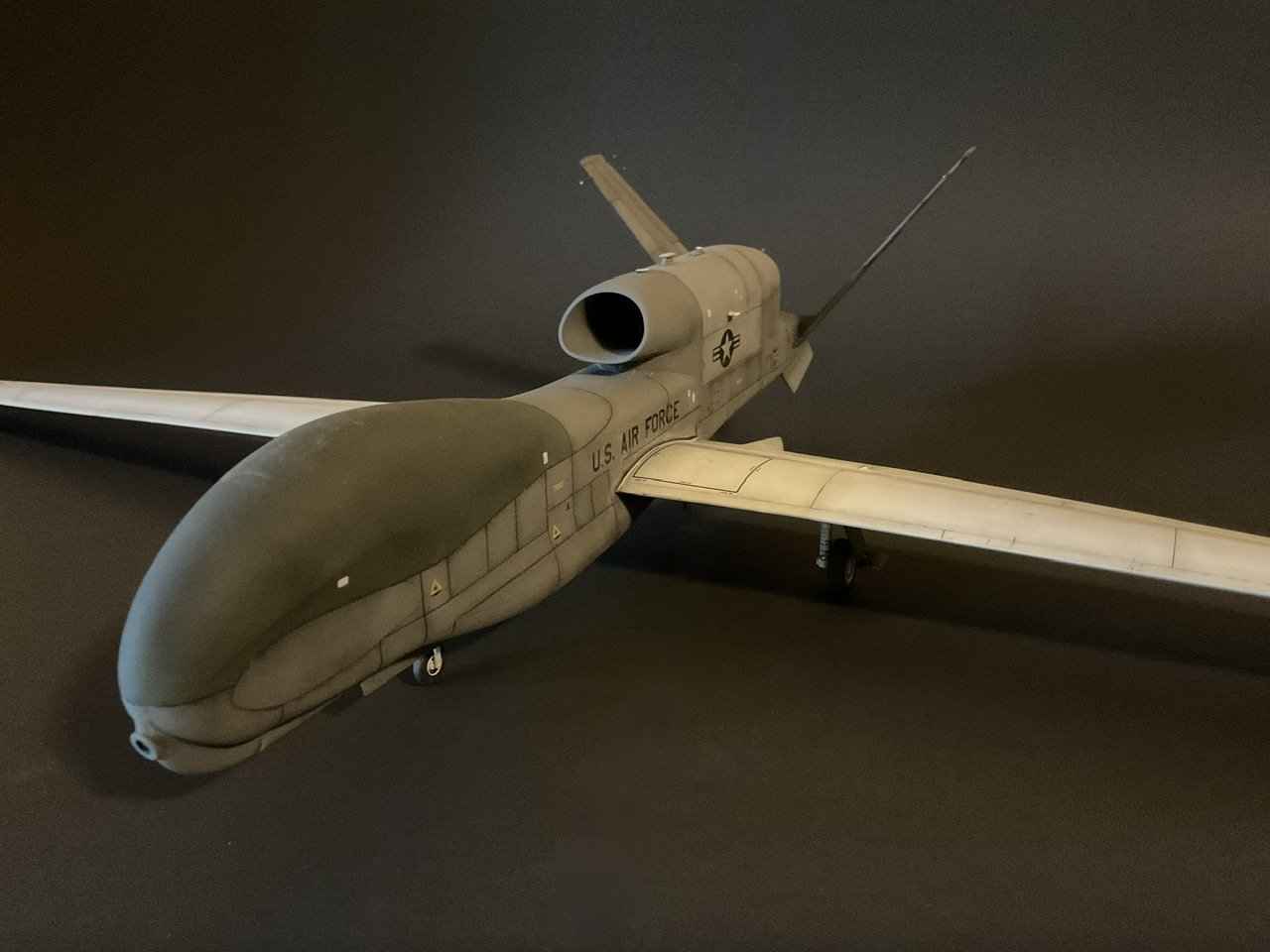 BornToBattle Posted August 12 Posted August 12 (edited) United States Air Force Global Hawk. It is an unmanned aircraft system (UAS) that can fly up to 60,000 feet in altitude and over 30 hours in duration. It is used for reconnaissance, intelligence and surveillance and provides real-time data to ground units. In 1994 the initial cost per aircraft was to be $10 million USD. By 2001 this had risen to $60.9 million USD and in 2013 it had grown to $131.4 million per aircraft. The USAF plans to retire it’s fleet of Global Hawks in 2027. The kit is by Kinetic and like all my aircraft is 1/48 scale. This means that the real life wingspan of 130 feet translates to a 32” wingspan in 1/48 scale, making in hard to photograph correctly and airbrushing even more so. Scratch made static wicks and front camera lens assembly added. Typical Kinetic kit with mislabeled parts and absolutely terrible decals compared to the other kit I made by them. It didn’t turn out as I had envisioned it but like I say, this is a constant ongoing learning process for me as I pick up new skill sets and refine current ones. Edited August 12 by BornToBattle 8