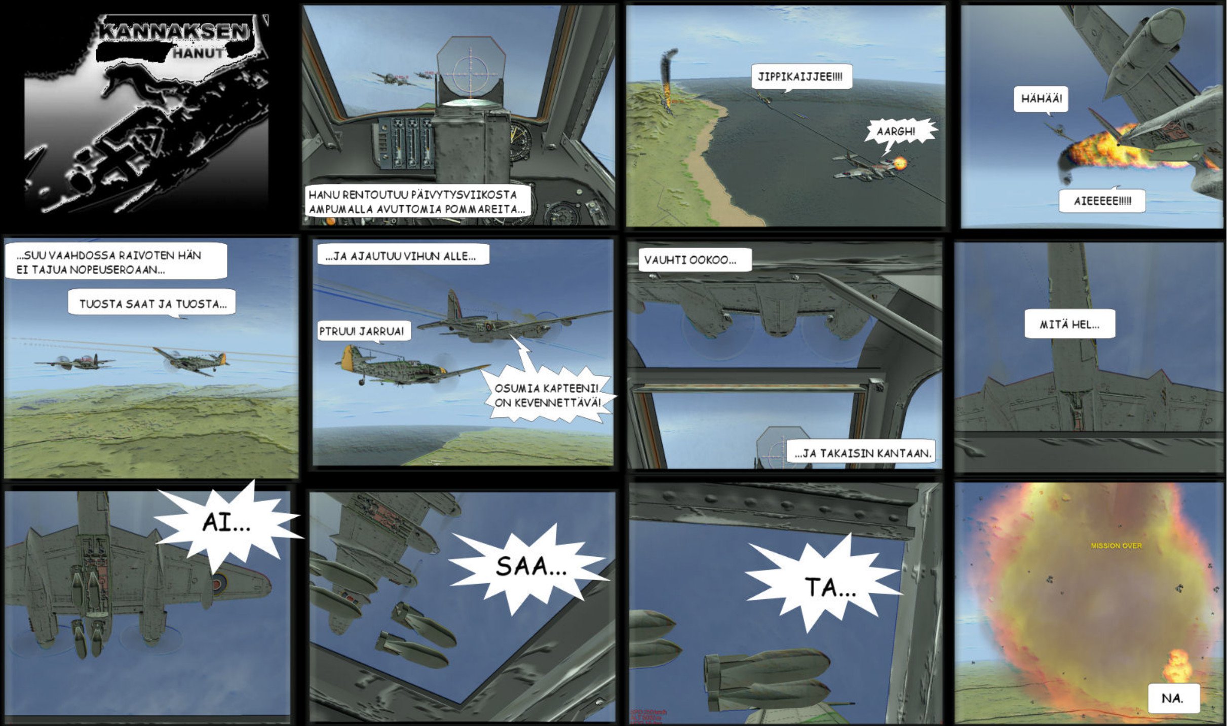 6./ZG26_Loke Posted June 7, 2020 Posted June 7, 2020 On 6/4/2020 at 1:27 PM, Hanu said: Sure, but "helpless" opponents can be dangerous too! ? This bring to my mind my old comic strip I created from real event during old IL-2 '46 days... Language is bizarre Finnish, but the luckily the story is quite self-explanatory... Hanu is relaxing after his work-week by shooting helpless bombers... However being too excited I almost "undershooted" the last one and managed to slow down under it... I had scored a few hits to engine and AI pilot had to do something to keep his crate in the air... Last line of speech bubbles goes like "OH - FECK - ING - crap" I made a small and a bit larger comic back then too.