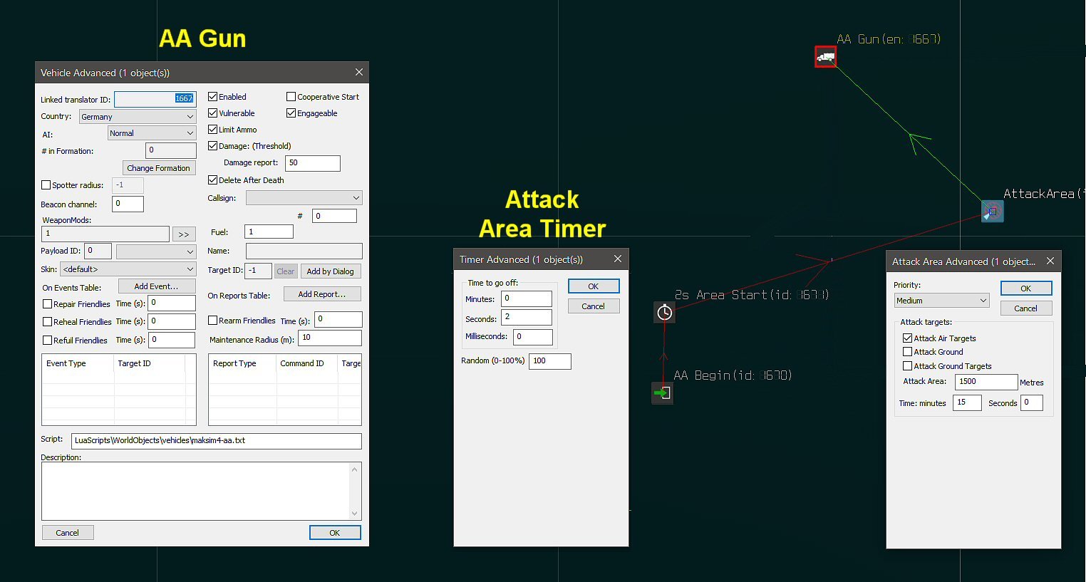 Beebop Posted June 5, 2020 Posted June 5, 2020 On the Kuban map I have a transmitter station I want to attack. I have set up the gun as per Prangster's ME Guide. the only thing I didn't do was replace the Mission Start with a Complex Trigger. It seems the logic should work but when I fly over the target the gun does not fire. I did try using the complex trigger as per instructions and using it to replace the Mission Start but I have the same results. One time when I was attacking I looked back after the attack and the gun did not have it's gunner and was aimed almost 180 degrees from my placement. I did not have any notice of destroying the gun and the gun was intact, just gunnerless. Attached are screenshots of the actual emplacement and the logic with the various Advanced Properties boxes open. Am I doing something wrong? Is the place on the map or the placement of objects I am using prohibiting the gun from firing?