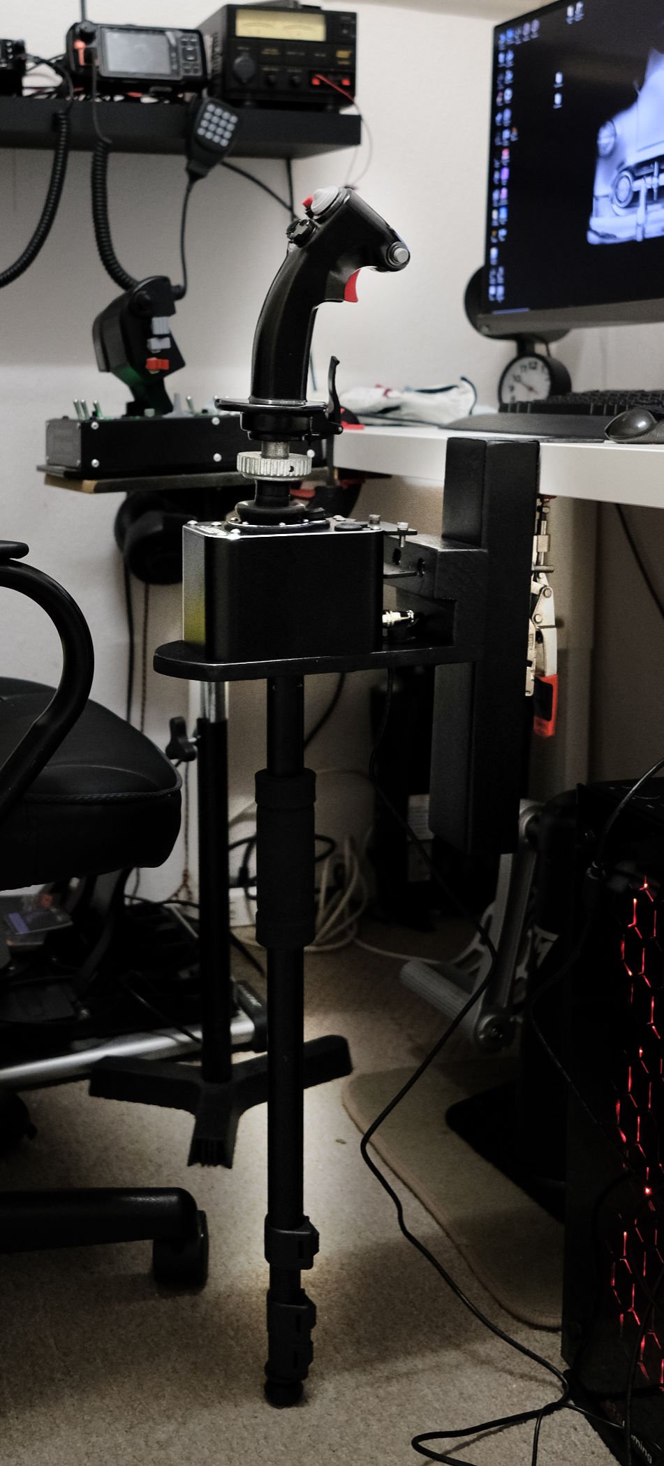 ST_Nooney Posted June 6, 2020 Posted June 6, 2020 If anyone has bought themselves a Virpil T50 base as I did, and (1) seen that Virpil are always out of stock on there base brackets or (2) seen the price of some of the manufactures base brackets, well it's a fairly easy process to make your own. Parts List Approx' 2 foot of 2" x 4" planed timber MDF 1 x Right angled bracket (Long enough to fit over the top of your desk) 2 x M6 100mm cap head bolts. 2 x M6 nuts and washers 4 x M4 bolts and washers for attaching base plate to MDF 1 x Bessey 25 mm stroke push pull clamp 1 x optional camera monopod for extra support (7 Day Shop sell them around £7) I decided to make my own due to the reasons listed above, and as the chippies amongst us will see I am no woodworker, but necessity is the mother of invention. The monopod was one I had were the head bolt had broken off so I adapted it as a support, the 7 D.S one fitted the bill in that it had 4 holes in the base that all I had to do was drill it out and put 4 M4 bolts through (I suppose the centre one would have been just as good but I had the M4's in the tool bag so used them). The monopod is now just a push fit onto the adaptor as a support, if I need the desk I just pull it off the adaptor and release the Bessey in seconds and have a free desk space, the same go's for the throttle unit. Some pictures included to see the finished support, it works fine and is solid, in fact so good I shot Zoo down twice in my first flight using it lol. Total cost was around £30 and the most expensive bit was the Bessey at £27 so saved a lot of money doing it myself. I took the base plate off the T50 and the M4 cap heads replaced with 16mm M4 cap heads going straight through the MDF and I added some metal strips underneath just for extra security, the same base would also do for a Warthog (my Virpil replaced), obviously with different hole placement. So save yourself some money to spend on collector aircraft and build your own :)