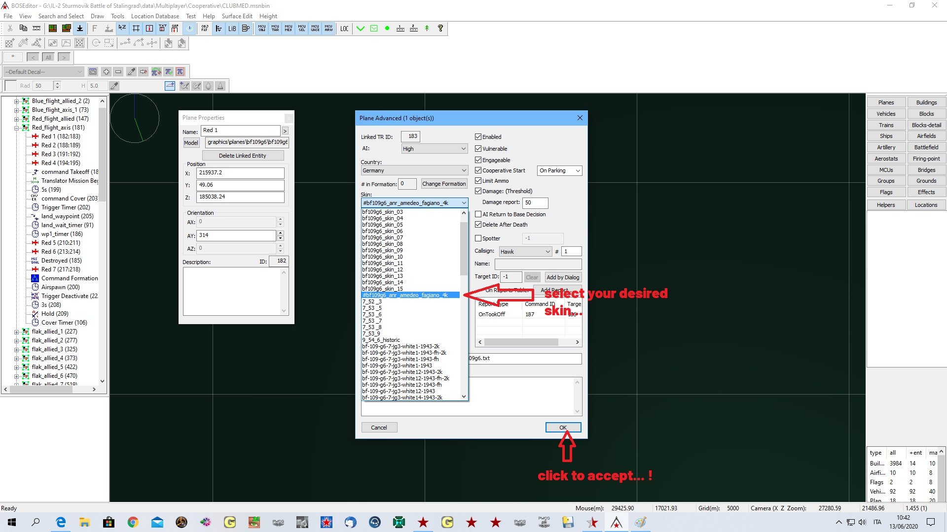Mysticpuma Posted June 11, 2020 Author Posted June 11, 2020 (edited) Well, I gave it a go and as expected....very difficult to understand the FME. I created the mission as per the directions in the Easy Mission Editor. Then loaded the mission into the Full Mission Editor. I managed to find the flight of aircraft and change them from P39's to P51's (as the latest version of EME doesn't seem to allow the choice of P-51?) Anyway, I canged the aircraft but in FME could not see anywhere or anyway of changing the individual aircraft skins. Everything else in EME works fine, just need some help working out how to change the aircraft skins so each one is different? Any further help appreciated, cheers, MP Edited June 11, 2020 by Mysticpuma