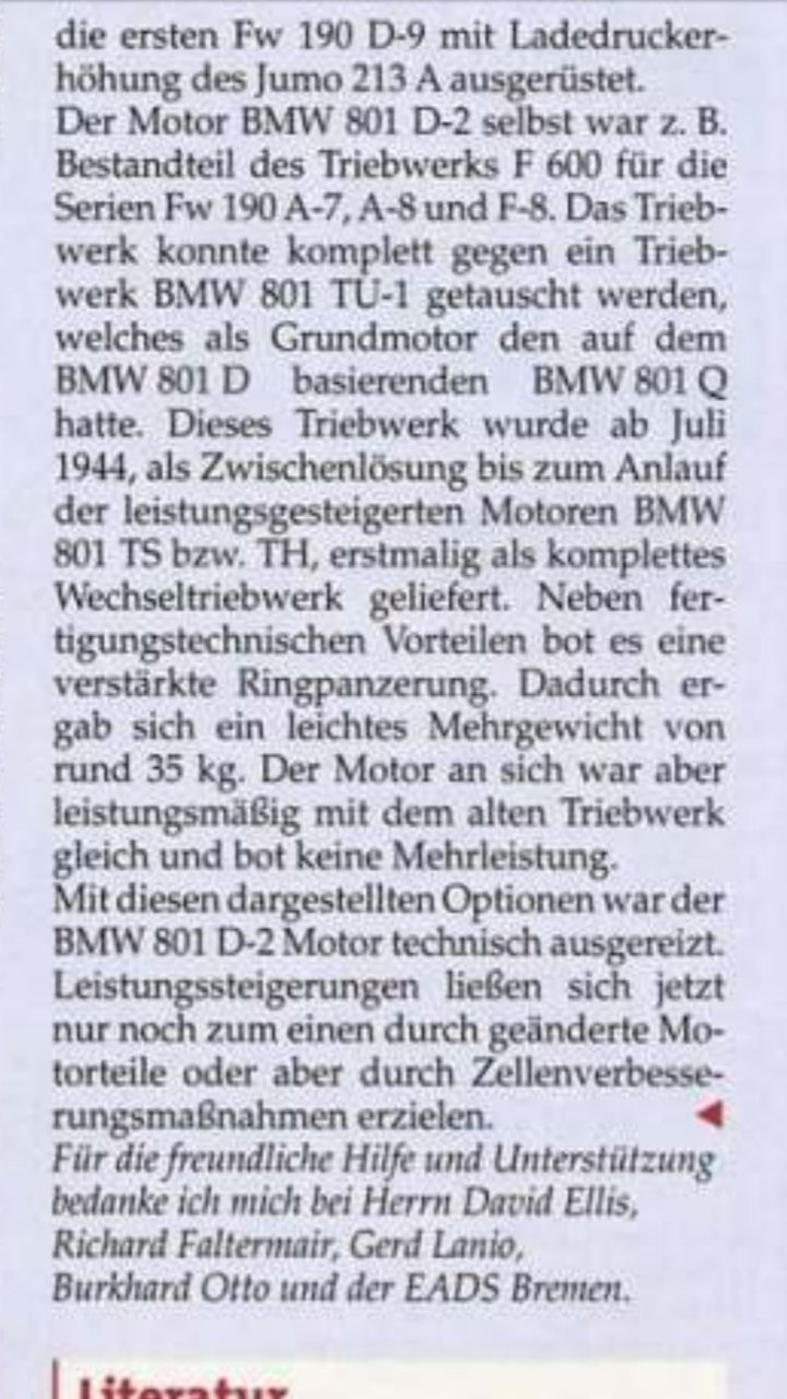 SAS_Storebror Posted June 23, 2020 Posted June 23, 2020 10 hours ago, JV69badatflyski said: pushing the801d to1.8ata Sounds a bit out of bounds to me. Even with the latest late war "Leistungssteigerung", where the boost pressure regulator ran in a kind of "uncapped overdrive" mode using a simple valve, the pressure in the low blower gear was limited to 1.58 ATA and in the high blower gear it was 1.65 ATA. I've seen a couple of mentionings of this "Leistungssteigerung" where apparently people made a typo and quoted 1.8 ATA where instead it should read 1.58 ATA - it becomes apparent when the "1.8 ATA" guys state that the engine provides 2050hp power in that mode - that's the power at 1.58 ATA. Link for german readers, others might want to use Google Translate: https://www.deutscheluftwaffe.com/archiv/Dokumente/ABC/m/Motoren/BMW/Leistungssteigerung/BMW 801 D Leistungssteigerung.html Mike 1 1 1
