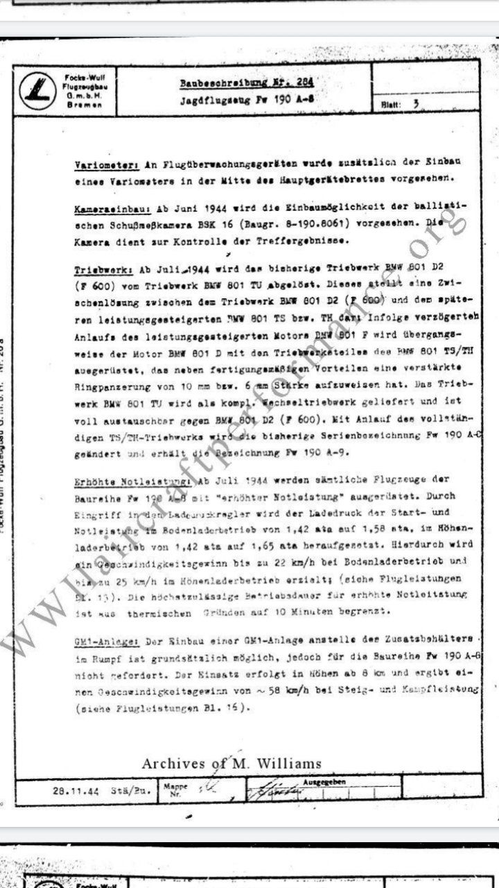 41Sqn_Skipper Posted June 20, 2020 Posted June 20, 2020 (edited) 5 hours ago, CUJO_1970 said: but it is incorrect to conclude that all A8 prior to Normandy did not have EN as any D2 F600 powerplant and all TU power plants could utilize it...and in fact the same web site you use shows BMW began producing the piping and blinds for the system already in March 1944. You mean this? It doesn't state that these parts are already in production, only that they can be delivered from March 1944 on. Sounds a bit like "If you order now, we produce it and it can be delivered in 2 weeks". Which would makes sense as the document clearly states: "Values at the moment not yet allowed by Rechelin". BMW would not mass-produce parts that are not cleared for service use. Clearance happend in July 1944 by Baubeschreibung Nr. 284. This date is even backed up by the eye -witness account posted above. Regarding the claimed earlier availablitiy of field modification kits compared to production: Aircraft in service the were cleared with Änderungsanweisung 133. Regarding 801 TU engine: was available from July 1944 on. So yes, it's save to conclude that there was no Fw 190 A8 in service that used Erhöhte Notleistung before July 1944, as it was not cleared/allowed (even if the engine was capable of doing it after minor modification, no one is denying that). Edited June 20, 2020 by 41Sqn_Skipper 1