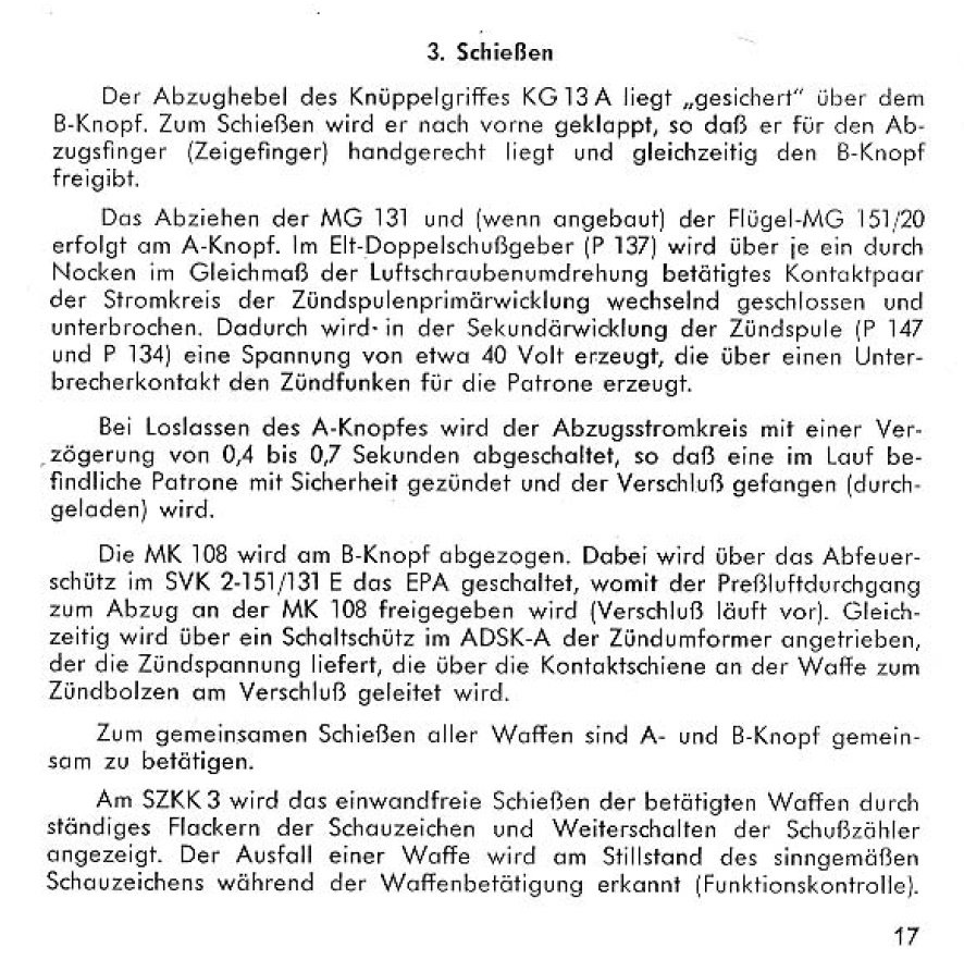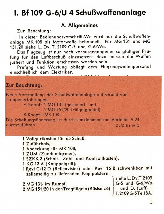 sevenless Posted June 15, 2020 Posted June 15, 2020 (edited) 1 hour ago, Yogiflight said: @sevenless is the text from the manual, you posted above it? Because the manual says MK 108 wing gondolas, while the text is about MG 151/20 wing gondolas and MK 108 engine cannon. It makes sense to shoot the 151/20 gondola guns together with the 131 machine guns, as their trajectory is much closer than the one of the 108. But what you quoted was about the ammo counter in the K4, which in my opinion would have made more sense to make the one counter for the 108 and the other one for the 131s, as you don't need to see if the left machine gun has as much ammo left as the right one, so one counter for both machine guns would have been enough. But it seems german engineers/pilots/Luftwaffe leaders were different opinion. Hi Yogi, you find the complete manual here: http://109lair.hobbyvista.com/techref/manuals/bf109g6u4.pdf The quotes I posted from that refer to the central Mk108 of the G6/U4. If you are interested in the manual for the gondola Mk 108s (I think it is Rüstsatz 6 mod) which also were tested but AFAIK never saw service in the field, please have a look here: https://www.deutscheluftwaffe.com/archiv/Dokumente/ABC/m/Messerschmitt/Me 109/Bf 109 G-6 U4 Wa Beiheft 1 MK 108.pdf That one, about the gondolas, also has a picture about the ammo counters. See page 17 and about the ballistic trajectories. Quote so one counter for both machine guns would have been enough. Yes and that was how it was done if the G6 was carrying gondolas (my guess). One counter MG131, one counter Mk108 and one counter wing (2xMk108 or 2xMG 151) if I understand the manual correctly. The interesting part about the 2xMk108 manual is this on page 6: So in case the 109 is flying with 5 guns (3xMk108), then Button A is triggering (2x131 and 1x108) and Button B is triggering the gondola Mk108s. That means it is only a question of telling your weapons guy how you want to have your weapons grouped and wired. Could be done in the field easily. Edited June 15, 2020 by sevenless