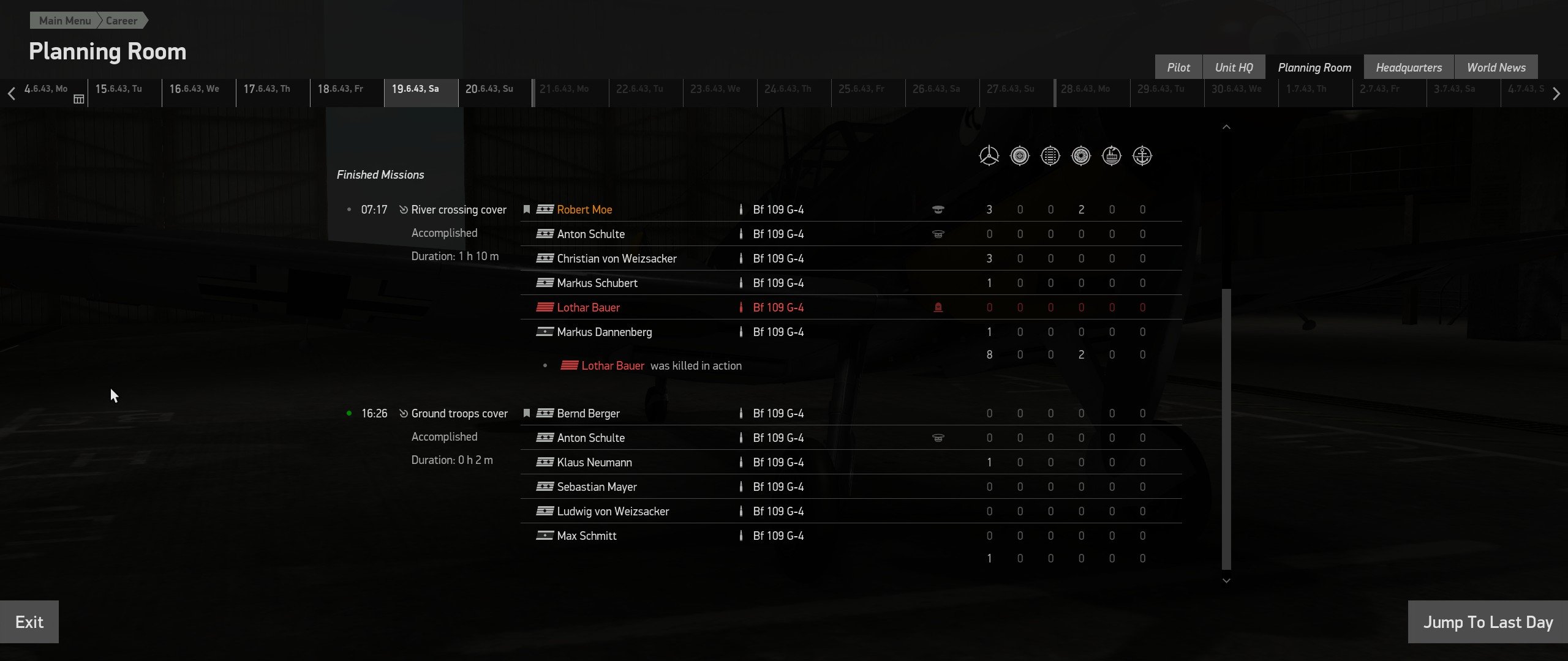 Ram399 Posted June 20, 2020 Posted June 20, 2020 A whole thread might be a bit overkill for this question, but I couldn't find anywhere else really fitting to ask. In short, I'm curious if theres any basis for the number of missions a squadron might fly in a single day across the career modes. As I've spent far more hours than I'm willing to admit flying in the career mode, I've noticed that while the career speed setting affects the number of days the player's unit has flight operations, the number of flights flown on a given day when there are operations generally sticks to a set number. However, in every career I have flown (generally on realistic speed) this number starts rather high around 3 to 4 sorties per day, before dropping to 2 sorties per day at some point and continuing as such until the end. In Moscow we started with 3 sorties per day, before dropping to 2 around late November which continued until January when JG 52 left the theater. And then in Stalingrad we started with 3 sorties before JG 52 was transferred south in the beginning of September, and then returned in December with 2 sorties per day again. I can understand the number of sorties flown might vary based off of overall activity in the theater, but for whatever reason this decrease never seems to be explained or reversed. Two missions per day makes sense for units such as bomber groups and the like. But with the relatively recent jump up in squadron size, dividing 2 sorties per day between 18 fighter pilots means a number of them rarely see combat. This drop occurred most recently in my JG 52 Kuban career between June 18th, 1943 and June 19th, 1943 (Exactly 2 months after the career started on April 18th). For every day prior to June 19th we had been flying 4 sorties per day, and the sudden drop off in flights after 2 months of 4 sorties per day has been somewhat of a let down to say the least. JG 52 is the only fighter wing on the peninsula after all, it would make more sense if we were extremely overtaxed rather then having a mere half our pilots go up on any given day. Has anyone else noticed an issue along this line? I'm not sure if its a weird bug or if its actually intended to be this way, either way some clarification would be appreciated. June 18th: Spoiler June 19th: Spoiler 1