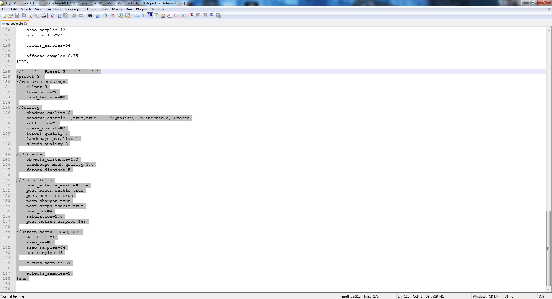 Draconus Posted July 11, 2020 Author Posted July 11, 2020 (edited) Hey everyone been busy like crazy all week wanted to get on here sooner but havent had the time ..... So im going to do couple write ups what can actually be messed with in Tank crew...first well start with basics and how to unpack the archives game has in GTP format There is a tool on the il 2 forums i found thatl unpack all of them into a (null) folder so you simply go in there will be sub folders in same files structure as ones in game directory you will also need JSGME mod loader to load the mod in that you are going to create...i do not recommend modding the game directly always create a mod and use the mod loader to laod the mod into game .....simple example were gona do for this example mod ... So first here is the il 2 gtp unpacker tool,place this into game directory drag/drop a gtp file over it to unpack it ...little window will pop up showing file being unpacked into (null)folder which will be sitting at top of the game directory.... IL-2 GTP Unpacker Zip ---------------------------------- unGTP-IL2.zip Here is example pic of how tool works when its unpacks the files ... Know here is JSGME Mod Loader which you will also need to mod game properly Dowload and place both jsgme files in game directory and start the mod loader ...a new folder will pop up in game directory called MODS...this is were all mods will be placed to load into game JSGME-Mod-Loader Zip JSGME-Mod-Loader.zip Know for this example were are going to create a simple mod called Graphic Improvements Go into MODS folder and create this folder...know back out to main game directory and find the scripts.gtp...drag it down to unpacker exe and itl unpack ...once done scrool above to top youl see the (null) folder Look in folder there will be luascripts folder....cut that and place into folder you created....Rename luascripts to LuaScripts so itl load into main lua scripts folder found in game directory open up the folder youl see this Know look for gpresets file and open it up using word pad ,notepad or c++ note pad(what i use ) Youl scroll down to preset 3 if you own high end system and select highest graphic preset its looks like this different stock values though which we will get into here Edited July 11, 2020 by Draconus