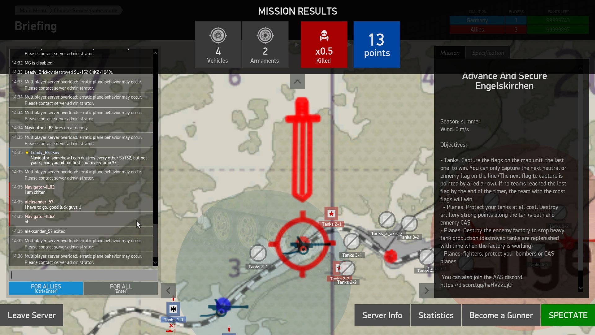 stupor-mundi Posted February 4, 2024 Posted February 4, 2024 Can something (mission-design wise) be done about the gangbanging? Weirdly, there's a situation now where players show up in gangs (of one color) and appear to enjoy doing the missions without (player) opposition, just destroying AIs. And, somehow, seem to enjoy ripping through the missions as fast as possible. For me, it's annoying, because, due to the slow-motion effect I can only play a subset of the missions at all. So I wait for those missions to come up. Just now for instance, after Prelestnoye, I waited for Etretat but missed it because only a group of blues joined and went through it in 18 minutes. Then I thought ok I'll do Tessy that's a few missions away. But bang, missed it, the same group went through Tessy in 6 minutes. Only the blue side can do this, because without player opposition they can rely on their strong front armor when merely dealing with AIs/stats. So, I don't know, since I never tried to create a map, is there some mechanism which could be used to slow down map progression, to give opposing players a chance to join before the mission is over?