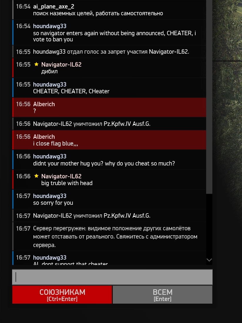 Navigator-IL62 Posted October 19, 2024 Posted October 19, 2024 I often encounter various accusations and insults. The second to last player who accused me of cheating was "hondawg33". That character generally imagined himself to be the messiah. That's why I wrote to you that "I'm a cheater", anticipating another accusation of this. As for this game, why did you decide that the problems were with my client? Maybe they were with yours? After all, the AI tank managed to shoot me down without any difficulty. And flying tanks don't bother you? Although, I have an assumption, your bullets from New Zealand have about a 16-hour flight to Engelskirchen. Joke))) 1 1