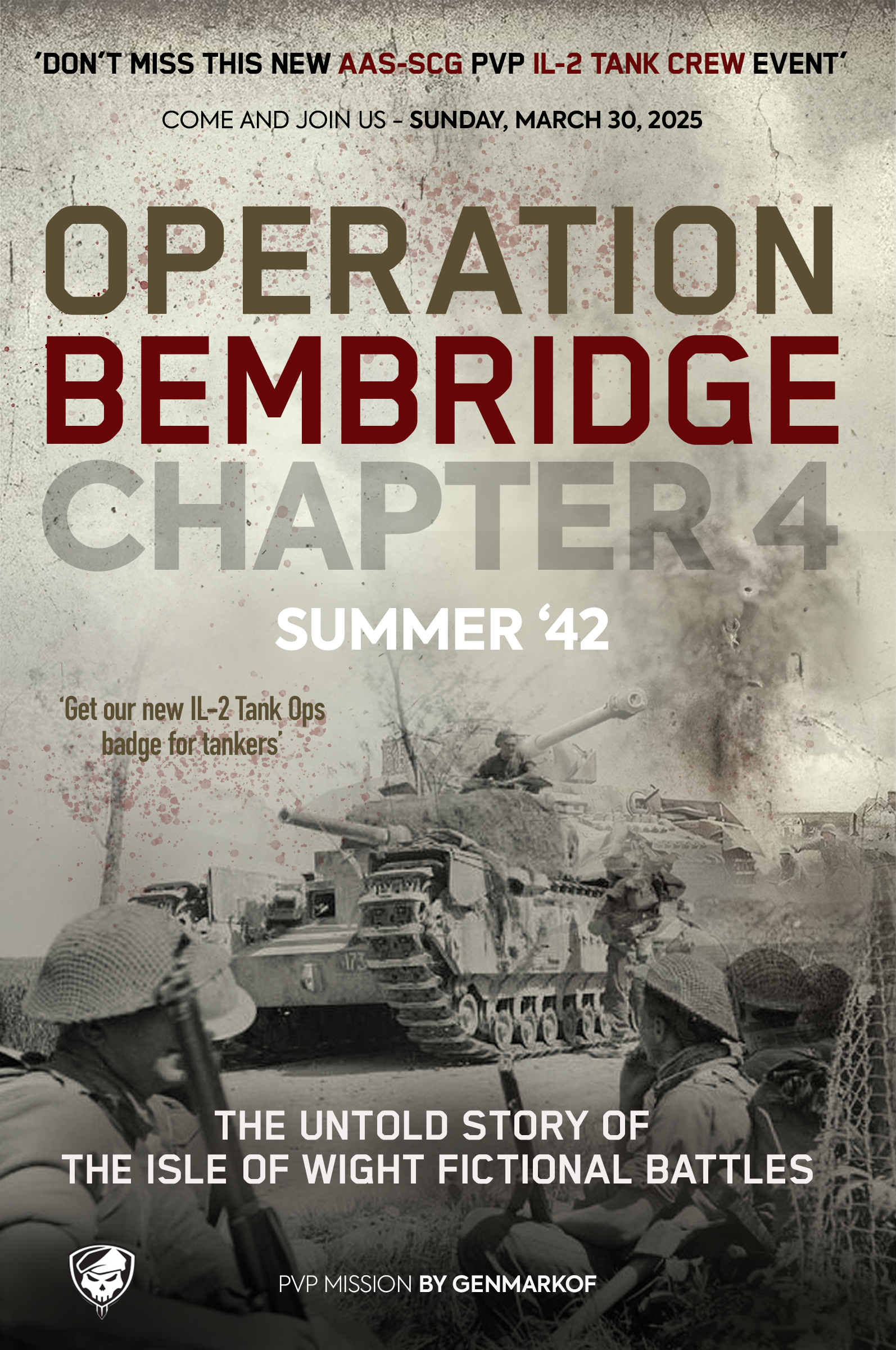 GenMarkof007 Posted February 2 Posted February 2 (edited) AAS-SCG PvP IL-2 Tank Crew Event - Chapter 4 - 'Operation Brembridge' - Summer 42 Advance and Secure (AAS) and SCG are organizing Sunday, February 16, 2025, an IL-2 Great Battles PVP TC mission about the fictional battles of the Isle of Wight - Chapter 4 - 'Operation Bembridge - Summer '42'. Don't miss this Advance and Secure & SCG Tank Crew Event... soon on your screen! Date & Time: Sunday, February 16 at 7 pm UTC+1 (Paris Time). Date & Time: Sunday, March 30th. (Your time zone available after you register). Server Name: AAS-SCG PvP Events To register, please confirm your interest on the AAS Discord invitation. You can find more information about the event and register on the Advance and Secure Discord - Events channel! https://discord.gg/vXteKpzy Important: For this mission, it will be a tank-only battle: M4A2 “Sherman”, Churchill V (limited=10 per base), PzKpfw III-M, PzKpfw IV Ausf. G, Stug III Ausf. G (limited=15), Sd. Kfz. 10 /5 vehicle (recon unit)(5), GAZ-MM 72-K (25mm) (recon unit)(5). * planes were removed for this mission - since we have a stability problem in this part of the map! ---- More details and information will follow soon. This event is open to all IL-2 Great Battles & Tank Crew players (tankers, and crews). Please spread the word to all Tankers players you may know! ---- Prizes: we might have special prizes like at the last event. So please join us for this new chapter of the Isle of Wight fictional Battles - Chapter 4 - Operation Bembridge - summer `42! Tank Skins: for this event, we suggest that you download the following "Skins Pack": Advance and Secure (AAS) and the SCG Tank Regiment on HSD (Haluter`s Skin Downloader). Since some of the Canadian and British Armour Division will have GAZ-MM 72-K (25mm) skins for this new battle! Try to download the latest skins package, and get HSD: Cheers, GenMarkof007 ---- New Date for this PvP TC Event... see info above! Edited March 29 by GenMarkof007 1