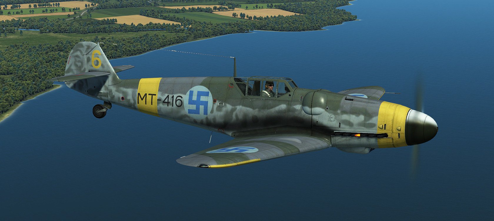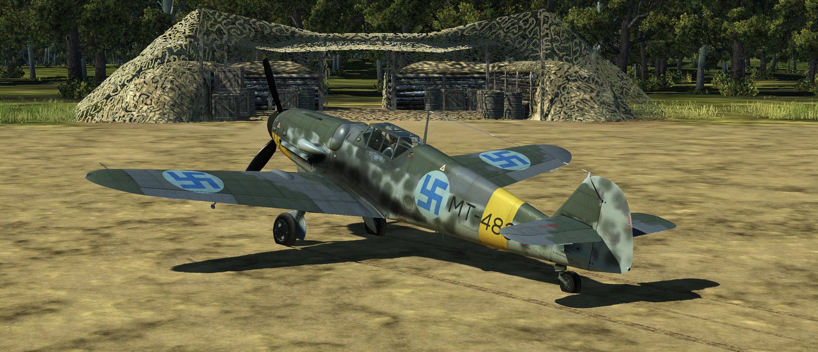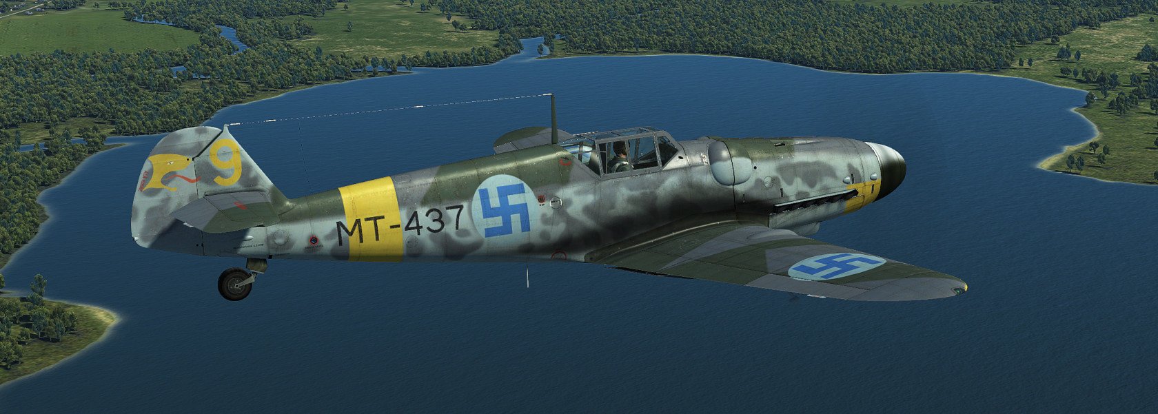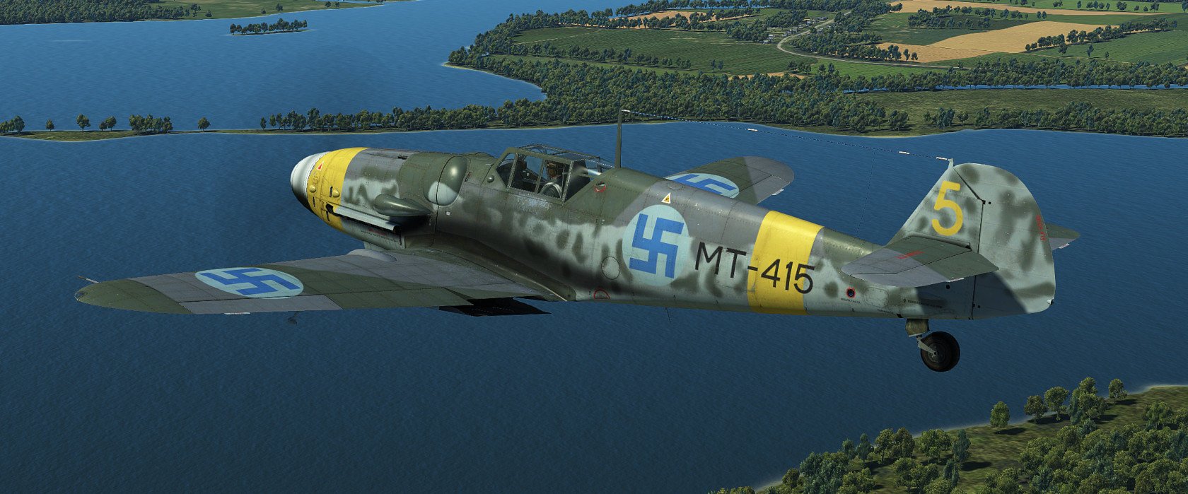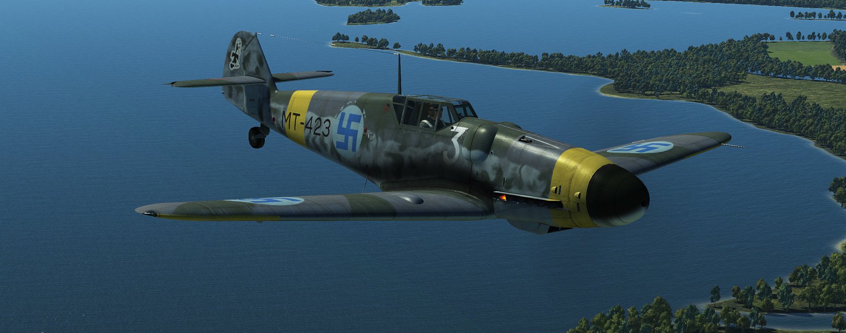 Hanu Posted September 5, 2020 Posted September 5, 2020 (edited) UPDATE: All the skins have been updated now as ICDP released 4k template for G6. THANK YOU!!! Most prominent changes are weathering, repositioned textures according to official 4k normal-map, fixes to radiator inner textures, Finnish Stencil layer (fixed some typos that the template had) and few problems with camopatterns as well as alpha-channel. The skins are combined with layers from all the artists listed in the original post and several of my own. Screenshots are not updated. ------------------------------ Zeus's wonderful Velikie Luki summer map gave me a very strong feeling of flying over Finnish countryside... I thought that this map needs Finnish skins, but there are too little published. (Oh, some donbass Hanu had done some amateurish stuff earlier... ?) So I was inspired again to revisit the skins I've created earlier (Oh boy how much errors there were, sorry for that) and create some new ones for G6 Early AFAIK these skins are as historic as possible. I've been using lots of time to study the planes, colors and plane's history but some guesswork had to be done. The colors RLM 21/27/65/70/74/75/76 are mostly from BlackHellHound's templates, some minor adjustments to RLM 27 (Yellow) in saturation as it looked too neonish-like color at least in my setup. Colors are always debatable and especially in Finnish literature especially RLM 74/75 seem to be a way too grayish usually. The templates/some layers I've used are practically from every possible pro-skinner here. Mainly the template is based on Kruger's work, which itself was based on ICDP's and RaFiGer's works. Some layers are from BlackHellHound's G2 template and also DetCord12b's RLM 75 layers are used. Sorry if I missed someone, not intentional. Thank you all!!! I've created several hand-painted layers of RLM 74/75 mottling from actual images, succeeding somewhat. Tactical numbers are also hand made. Register numbers are from a font Porsimo created for IL-2 '46 many years ago. Fixed some stuff in stencils and so on. My sources have been Stenman / Holda books mostly. Here is the link:https://1drv.ms/u/s!Ai1G8Nbf5lNHgppmiou96XyjxX6EvA?e=ihiS0z And the planes: MT-408, WNr. 411728. Used by 2/HLeLv 30 which was based on Malmi. Designated pilot 1st Lt. T.Kallio. Plane's fate was to crash on landing 24.7.1944. Flight time 64h 35min. No air victories Spoiler MT-411, WNr. 410896. Also used by 2/HLeLv 30. Belonged to 2nd Lt M. Halme. Survived the war. Flight time 300h. No air victories. The yellow ring on the engine was overpainted from the top Spoiler MT-415, WNr. 412105. Used by 3/HLeLv 34, Taipalsaari. Designted pilot was Msg K.Alikoski. However Major Eino Luukkanen (CO. of HLeLv 34) used this particular plane with great success, scoring 16 air victories with MT-415. Total amount was 20 victories for MT-415. Survived the war and timed quite stunning amount of 591h 45mins of flight time. NOTE: real MT-415 had a tall tail and early heavily-framed canopy, but this was too interesting plane, so I chose to use G6 early model for it anyway. Spoiler MT-416, WNr. 411704, Used by 3/HHLeLv 34, pilot Msg A. Nuorala who scored 6/10 of MT-416's victories. It's war-path ended in 29.6.1944 when Nuorala landed on the soft part of the runway and MT-416 was flipped over. Later repaired and total flight time was 298h 50min. Spoiler MT-423, WNr. 412122. Belonged to 1/HHLeLv 34, Msg. H.Leino. 4 different pilots scored one victory each with MT-423. 30th of June the other landing gear did not come out and Leino had to do forced landing. MT-423 did not make it to war anymore, but was repaired and total flight time was 306h 25min. It was decorated with the HLeLv 34's Eagle logo in the rudder. NOTE: real MT-423 had a tall tail and early heavily-framed canopy like MT-415. Spoiler MT-437, WNr. 163627 Used by 3/HHLeLv 24, pilot Msg. L.Ahokas. 4 air victories, 2 scored by Sgt K.Keskinummi. Was damaged during air combat and was sent to repairs, but did not make it in time to fly in war anymore. Flight time 310h 30min. Was equipped with Trop air filter. Tail rudder has HLeLv 24's very rare "Lynx" logo. Spoiler MT-453, WNr. 165274 Used by 1/HHLeLv 34, pilot Msg. O.Länsivaara. 5 air victories. Was equipped with 20mm gunpods. WO Antti Tani scored 3 IL-2's in one sortie with this plane. Survived the war. Flight time 300h. Was equipped with Trop air filter. Spoiler MT-482, WNr. 165185 Belonged to 3/HHLeLv 34, pilot 1st Ltn. L.Lehtonen. No air victories. Survived the war. Flight time 300h. Was equipped with Trop air filter. Spoiler MT-483, WNr. 710012 Used by 1/HHLeLv 24, pilot Cpt. A.Lassila. No air victories with MT-483. Survived the war. Flight time 250h. She was actually G-8 without cameras, but still portrayed here as the model of the plane was correct. Spoiler Edited September 23, 2020 by Hanu Major update 14 5 4