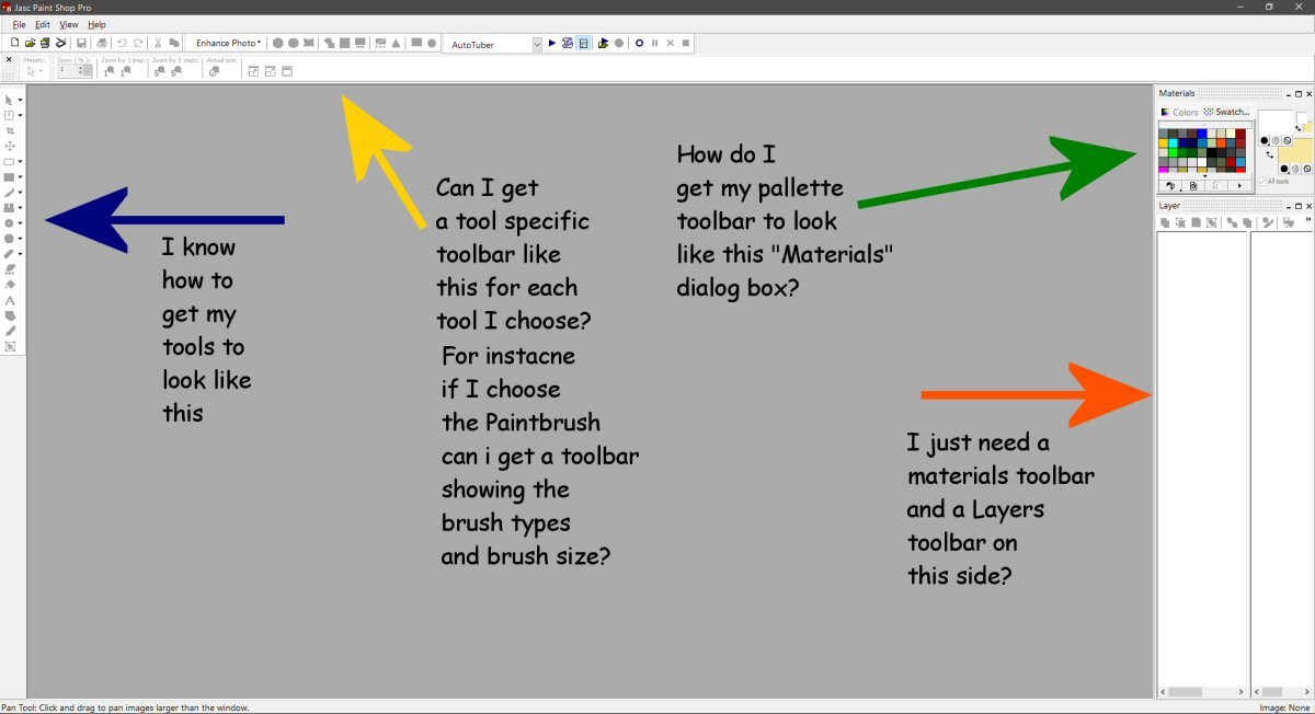 Beebop Posted September 9, 2020 Posted September 9, 2020 (edited) After fighting the need to change, I have finally come around to the fact that my old Paintshop Pro 8 32 bit program, as good as it is and as familiar as I am with it, needs to be put away for legacy work only. One thing that has off put me is understanding those "new-fangled" interfaces with all the colorful "smart phone app" icons etc and the new toolbars and dialogs. I tried upgrading to PSP 2019 because I found I could make it look and feel a lot like my old dinosaur. But when installed I got an 0xc0007b error but I already have DirectX12 and all the Net Framework updates, supposed solutions to that so I gave PSP 2019 the heave ho. So now I have GIMP 2.10.20 because it's effin' free, it handles .psd files, it can export .dds files (I already use it do that for my 2K skins) and a lot of folks here use it so it must work pretty good. But... the interface is a bit confusing to an old fart like me used to the "ancient prehistoric cave drawings" look of PSP8. What I would like to do to speed up my learning is make GIMP look as much like my PSP 8 interface as shown below so I am spending time learning how to manipulate the tools rather than trying to find them and figuring out how to make them work. I know all the tools I need and want are available, I just don't like the layout and that is 'slowing me down'. I don't expect any long drawn out tutorials from anyone, but links to good GIMP Tutorials that show how to achieve this look would be appreciated. Edited September 9, 2020 by Beebop