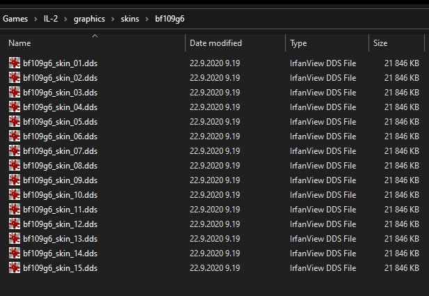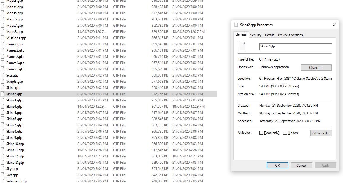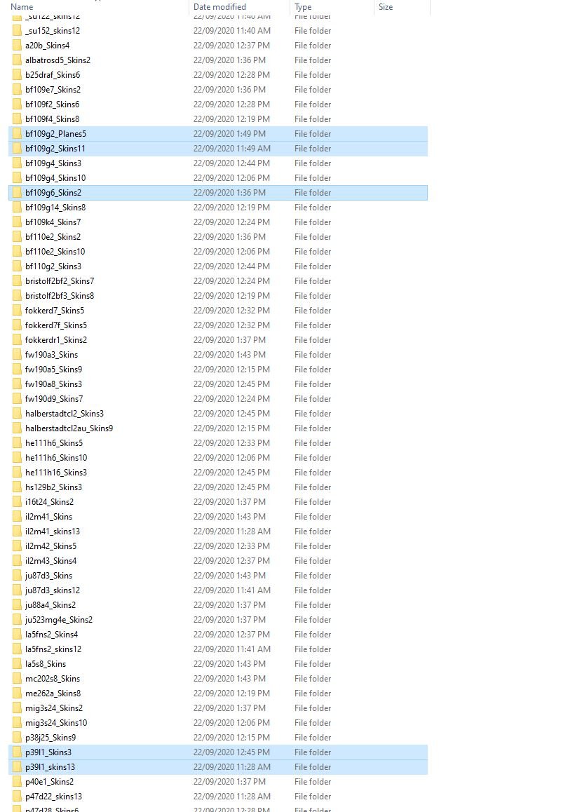 spudkopf Posted September 22, 2020 Author Posted September 22, 2020 (edited) 7 hours ago, Hanu said: Bf-109g6 is in Skins2.gtp file. Extracts under skins folder. Check that the file has this kind of timestamp: 21.09.2020 18.30 995 600 232 Skins2.gtp Otherwise there must have gone something wrong while upgrading. G'day Hanu Thanks for your response, yes I found that the Bf109G6 skin files reside in Skins2.GTP, and that the default skin is found in Planes2.GTP, but as I said when I extract these GTPs there are only 2K files for the Bf109G6 in them: Skins2.GTP Planes2.GTP The time stamp sadly is not of much help in this case, as it dependant upon when you installed the patch, as I updated my installation on Monday, it has Monday's date, however as you can see below the file size is the same for my Skins2.GTP as it is for yours: And as I also mentioned the 4K are definitely there, as I check them in the viewer, I have an older unpatched install on another drive, and the difference between the 2K and 4K files is very easy to see. So have you actually extracted files from Skins2.GTP and do you actually have 4K skins for the Bf109G6? If you can confirm that you have 4K files for the Bf109G6 extracted from your Skins2,GTP that would be great. Cheers Edited September 22, 2020 by spudkopf 1