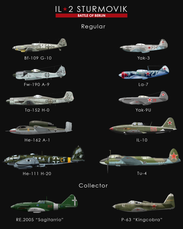 FallBondler Posted September 26, 2020 Posted September 26, 2020 My personal preference as someone who only plays fighters is not necessarily Berlin, just any battle which allows these planes: Allies Yak-3 La-7 Yak-9U (and UT) P-63 A or C - Wikipedia states that P-63s supposedly did see combat against the Germans according to multiple sources on both sides (although this was apparently concealed from the US by the Soviets) Axis Bf-109 G-10 He-162 Ta-152H FW-190 A-9 or F-9 Collector Planes Allies: Yak-3 VK107A - all-metal Yak-3 with VK107 engine (same as used on Yak-9) and 2 x B-20 cannon. Highest performance Soviet fighter of WW2 (>720kph) which saw combat in 1945. Axis: Do-335 A-2 I know they would never do this because of the low-production numbers on some of these planes and the lack of bombers/attackers which some people like to fly, but a man's gotta have a dream... 2 1