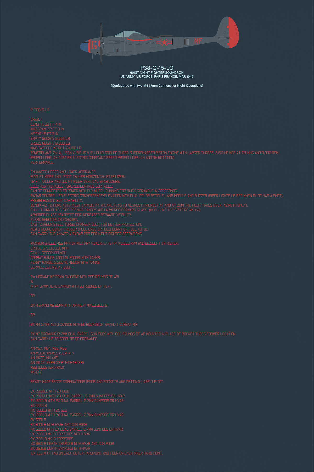SOLIDKREATE Posted September 23, 2020 Posted September 23, 2020 (edited) Here is a fantasy P-38 that I came up with. I thought in terms of what tech they had by 1946. It's just an fun idea but probably very impractical. 601st Night Fighter Squadron "Hell Bats" Coded NF-G and painted in Dark Blue Drab with Night visiblity red markings, and a Dark Blue Grey nose. (click to enlarge) Edited September 23, 2020 by VA_SOLIDKREATE 1
