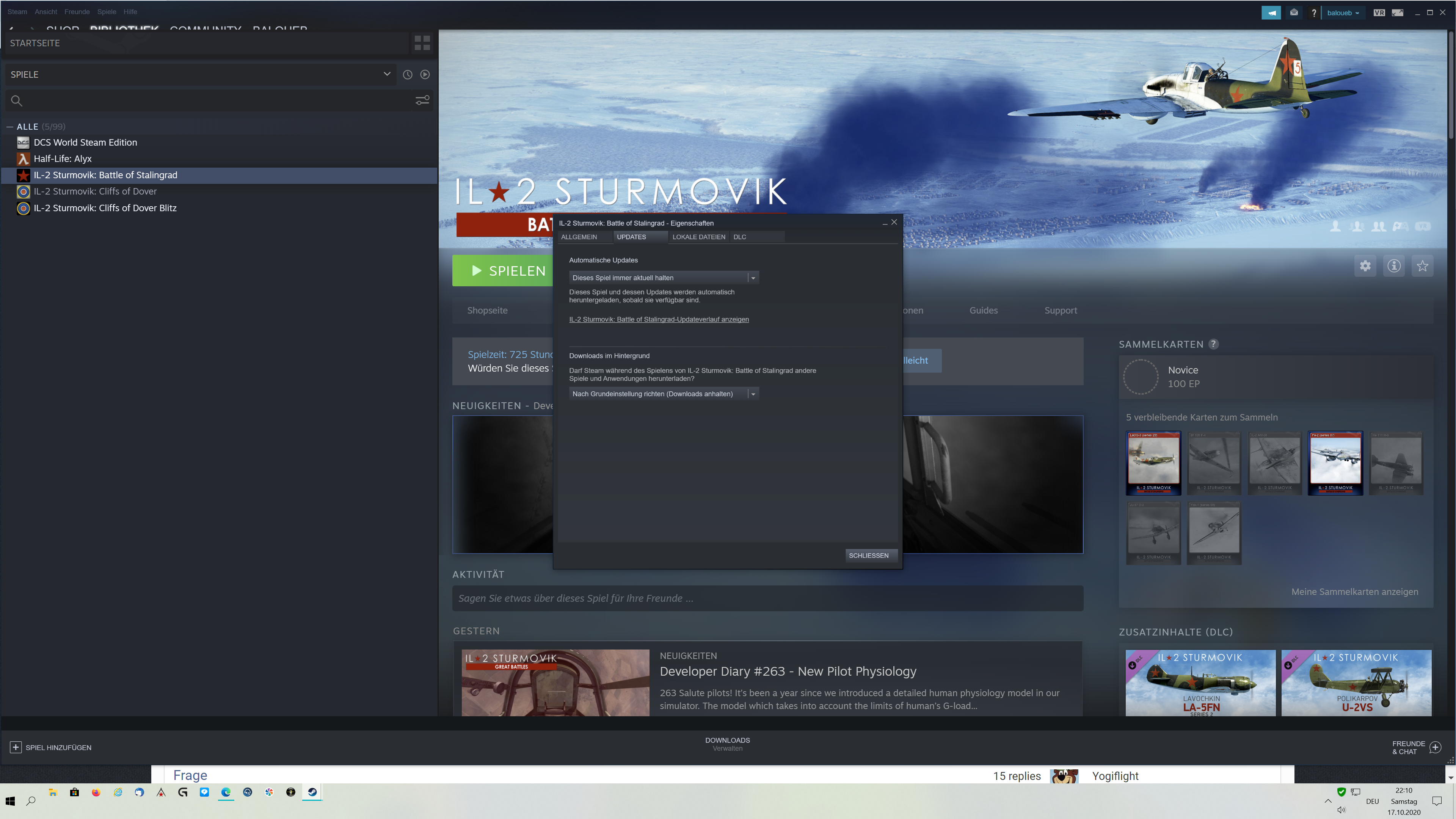 baloueb123 Posted October 17, 2020 Posted October 17, 2020 (edited) Hi Pitt61 Normalerweise startet der Update automatisch . Überprüfe folgende Einstellung : Rechtsklick auf das Spiel , dann auf "Eigenschaften - Updates ". Da sollte folgendes ausgewählt sein (siehe Bild): Falls Du es nicht lesen kannst : Dieses Spiel immer aktuell halten Sonst mal unter Eigenschaften ( Menüleiste oben links ) dann Eigenschaften - Downloads , mal die Download Region wechseln. Also von Germany Hamburg auf Germany Munich oder umgekehrt . Gruß balou Edited October 17, 2020 by baloueb123