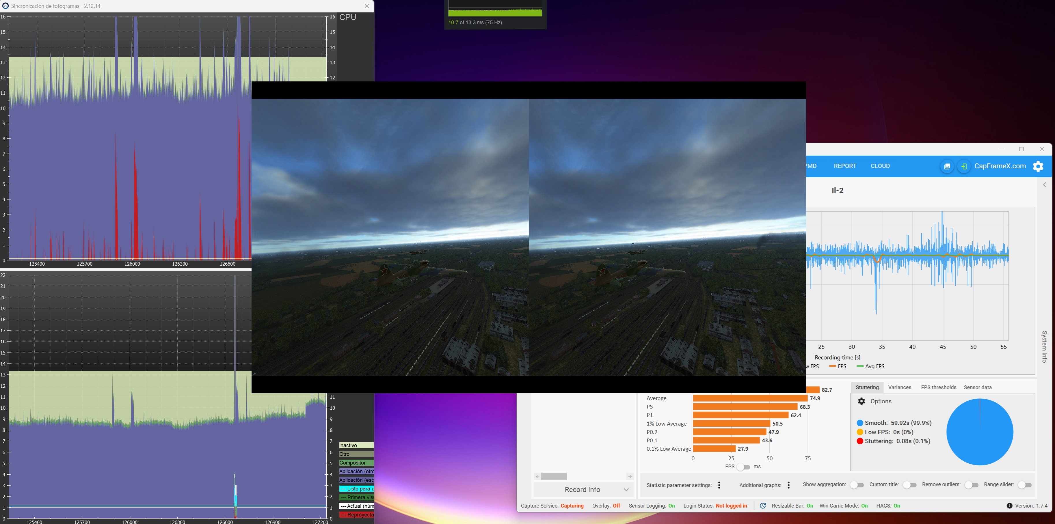 chiliwili69 Posted October 20 Author Posted October 20 (edited) Yesterday I was taking a look of three free applications to count and log fps: FrameView, OCAT and CapFrameX. FRAMEVIEW: https://www.nvidia.com/en-us/geforce/news/nvidia-frameview-power-and-performance-benchmarking-app-download https://images.nvidia.com/content/geforce/technologies/frameview/frameview-1-4-user-guide-web-version.pdf It is quick and easy to install. The Hotkey to do the capture can be only F10 or Scrolldown from the application menu, but editing with admin rights the start-ini file I was able to put the code of the type "P" which is the same to unpause IL-2. This is a drawback of FrameView. It also produce a overlay and a summary (where you can add 99%, 95%: Then, after running the benchmark it produces a summary in the overlay two CSV files (a summary, and a full log of the with a lot of information). If you edit them with the Notepad it is difficult to see anything, so you need a proper CSV viewer. I choose the free Microsoft Flow CSV Viewer (but there are many free viewers) and this is what you get from the two CSV files: Avg FPS, Min, Max, 1%Low, 0.1% low which is fine. And all the frametimes and other logs for GPU/CPU %load, temps, etc OCAT (Open Capture and Analysis Tool): https://gpuopen.com/ocat/ It is also quick and easy to install. It is also an Open Source app. The capture hotkey can be easly changed to "P" in the application: It also shows an overlay in the game and a summary after benchmark capture: As with FramewView, it also produce two detailed CSV files (summary, log) with a lot of info so you also need a CSV viewer. This is what you get: and the log OCAT has also a section to visualize the produced log, but it is very basic and not as user friendly as Flow CSV viewer. Edited October 20 by chiliwili69