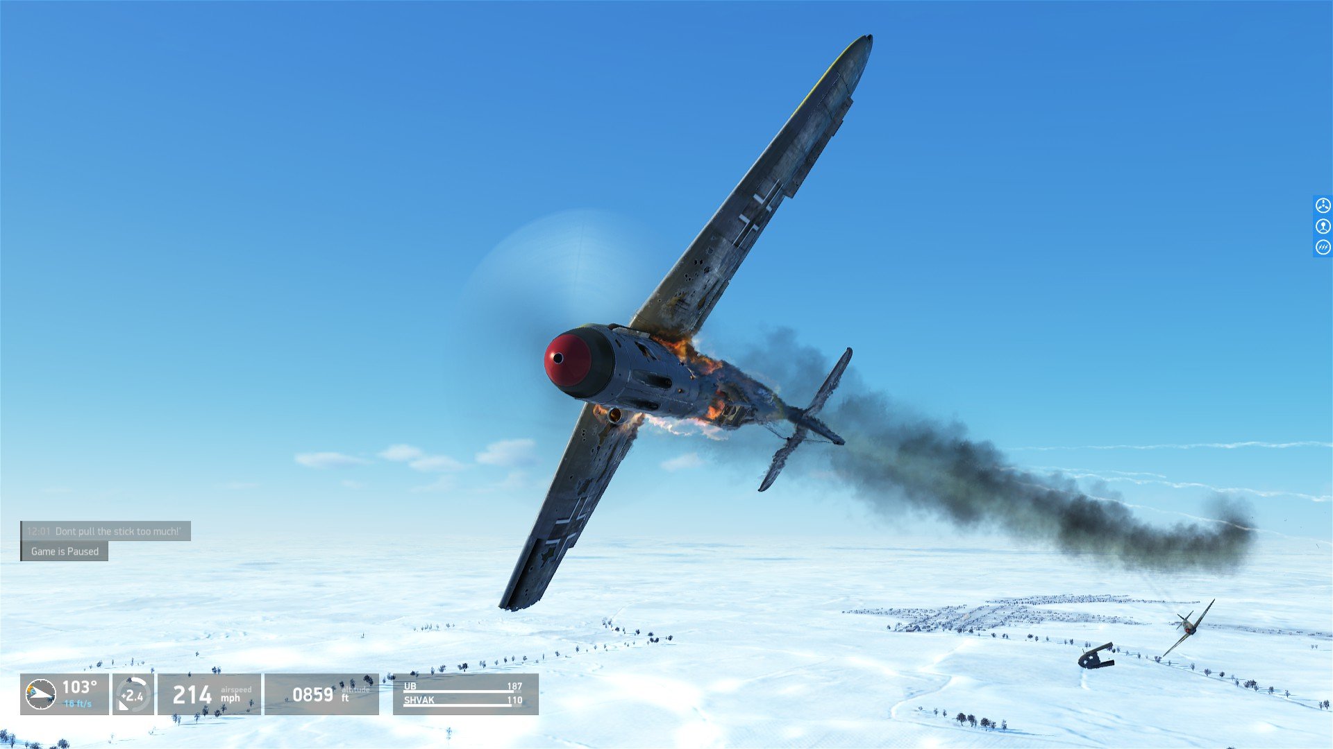oc2209 Posted December 5, 2020 Posted December 5, 2020 Sorry to clutter up the thread with something else, but here: https://www.youtube.com/watch?v=4KXT3Bqu6-U That's my personal track, from which the above screens were taken. Watching something is usually more informative than listening to it described. Unfortunately you can't see my HUD in the video, but you can hear the whooshing sound during the high-speed turn right after the clip starts. It's not the same as a stall buffet sound. The intense whoosh kind of tells you you're pulling some Gs around the 4+ range. At least I think it does. Some other points of interest: I don't use head tracking. I botched the first attack because the 109 was obscured by my armored windscreen frame, and I was misaligned to kill the pilot as he crossed in front of me. I included this mistake in the clip to show how easy it is to botch it. Practice makes kinda-almost-sometimes perfect. Oh, and the 109 in this clip is a plain G-6, default settings except for the glass headrest and 30mm I gave him.