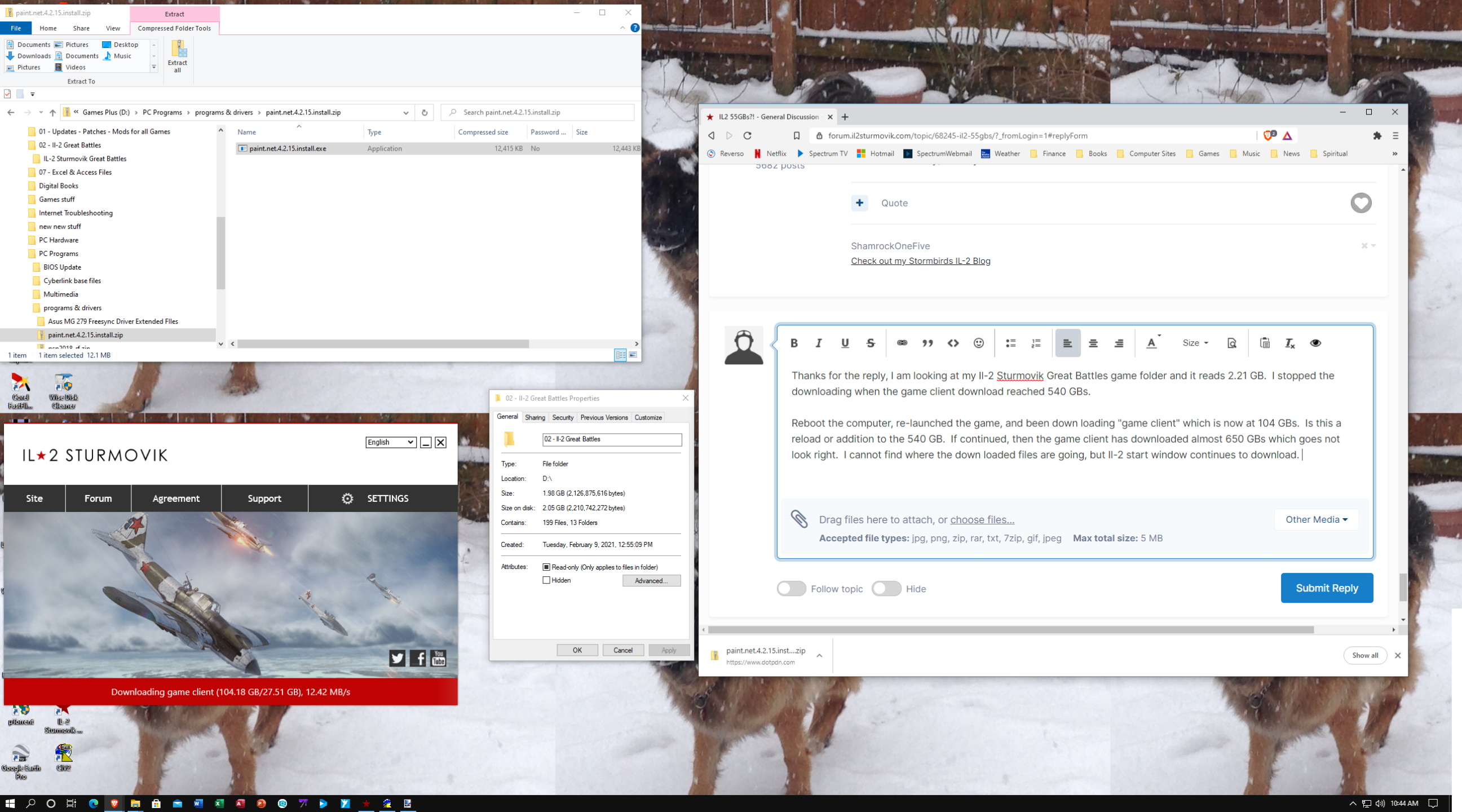 DougW Posted February 10, 2021 Posted February 10, 2021 Thanks for the reply, I am looking at my Il-2 Sturmovik Great Battles game folder and it reads 2.21 GB. I stopped the downloading when the game client download reached 540 GBs. Reboot the computer, re-launched the game, and been down loading "game client" which is now at 104 GBs. Is this a reload or addition to the 540 GB. If continued, then the game client has downloaded almost 650 GBs which goes not look right. I cannot find where the down loaded files are going, but Il-2 start window continues to download.