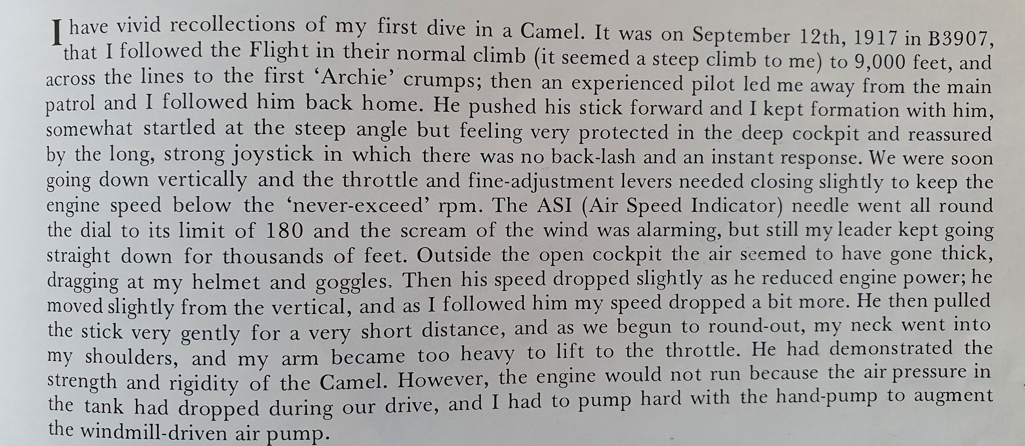 SYN_Ricky Posted January 10, 2021 Posted January 10, 2021 In Chad Bowyer's "Sopwith Camel - King of Combat" there is a section where he presents notes that Captain Ronald Sykes DFC, wrote about flying the Camel (150 HP BR1 engine). One is about diving, I join a screenshot of the excerpt.