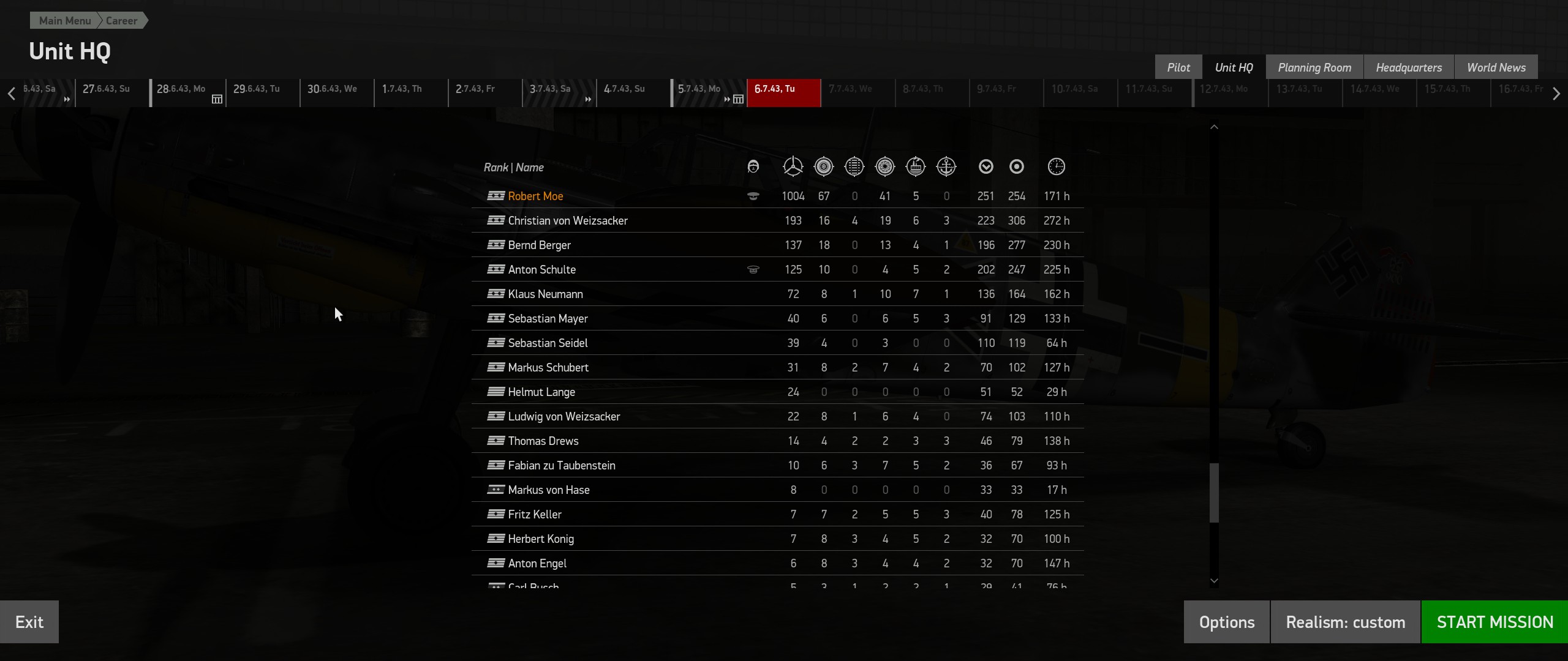 9./JG52Gruber Posted February 17, 2021 Posted February 17, 2021 Hi Luke, A few more potential improvements for your consideration. AI pilots in unit have a very odd ratio of successful missions to missions flown, something like 60%. As it is now I don't care about these AI because their canned stats are just garbage and I have no bond with them. Request that all new pilots that transfer in come with no stats regardless of rank. Low ranks like Feldwebel do this already but occasionally I get some officers with similar garbage canned stats. The zero stat guys I do care about because I can see them grow as the campaign advances. Plus seems unrealistic that highly experienced pilots would be transferring in considering manpower restrictions for all sides. Even an officer coming fresh from school can be a rookie. Stop transferring people out so much! It really stinks to see people get transferred for seemingly no reason. I will give context to this all with story of Ludwig Goldberg. As a veteran He 111 pilot with 400+ missions I took Ludwig under my wing when he joined II/KG55 as a rookie having just earned his pilots badge early in the BoK campaign. I made sure he flew my wing at all times. I watched over him as he flew over 40+ combat missions, earned both Iron Crosses, was promoted, and even wounded by AA over Gelendzhik when poor weather forced the flight to fly under the cloud ceiling to see the target. Very memorable stuff and really created some immersion. Then out of nowhere he was transferred to a fighter unit. I was angry to say the least. It would have been great stuff to see how far he could have gone and what the emotional toll of his actual loss would have meant.