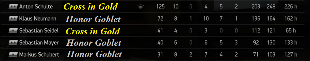 Ram399 Posted April 23, 2021 Posted April 23, 2021 11 hours ago, LukeFF said: confirm the current date in the campaign and whether or not you have any mods installed The current in game date for this career is July 6th, 1943. While I usually run the game with mods, for the purposes of testing this I progressed the career for a full week with mods disabled to the same results. I've seen both grades of Iron Cross as well as the Honor Goblet and all the grades of Wound Badge regularly awarded generally as they should be, so this only seems to apply to the higher awards for whatever reason. Thus far in the career I have had two AI pilots receive the Knights Cross, one retroactively after the update that fixed the awards at ~120 kills, and another who was awarded it upon reaching 100 kills. These awards both occurred from December of 2019 - February of 2020 in versions 4.003 and 4.004. By May 9th of 2020 however, I had another pilot reach the 100 kill threshold in version 4.005 and he was not given the award. I'm not sure what or why but something seems to have shifted with 4.005. That pilot is now at 125 kills still without the award, and the two who did receive the KC have yet to be given any higher grades of it despite sitting at 138 and 194 kills respectively. 12 hours ago, LukeFF said: pilots not being awarded medals properly on auto-generated missions With regard to my pilot who got the Cross in Gold at 41 kills while the pilot at 72 does not yet have it, I think in person vs auto-generated flights might be the problem. I use Seidel pretty much as my own dedicated wingman so to speak, which means he probably flies more in-person sorties than any other AI pilot in the unit- he has also been with the unit since Moscow so he's had a fair amount of time to build up experience so to speak. My working theory prior to the award update fixing things in 4.003 was that some award parameters were exclusively checking statistics from in-person missions, perhaps this is the case for the higher level Luftwaffe awards?