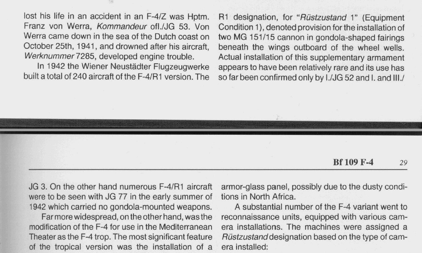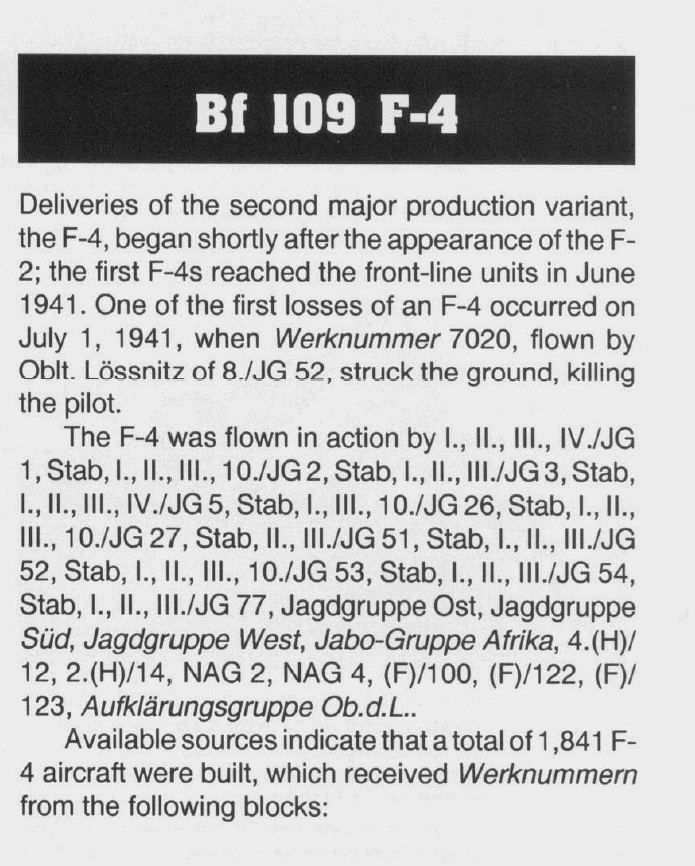 sevenless Posted July 26, 2021 Posted July 26, 2021 (edited) 18 minutes ago, LukeFF said: As for the appearance of the F-4, I think the hangup is that the DB 601 E wasn't cleared for full power until sometime around February 1942. Could well be. Maybe someone on this board has some further details on this. From Prien+Rodeike I can´t read a later intro date of the DB 601 E engine. He only mentiones that beginning with the 10000 and higher lots the machines received a larger supercharger air intake somewhen end of 1941. As for the R1 mod. Prien and Rodeike give the 12/41 date as the first mentioned production by WNF: Edited July 26, 2021 by sevenless