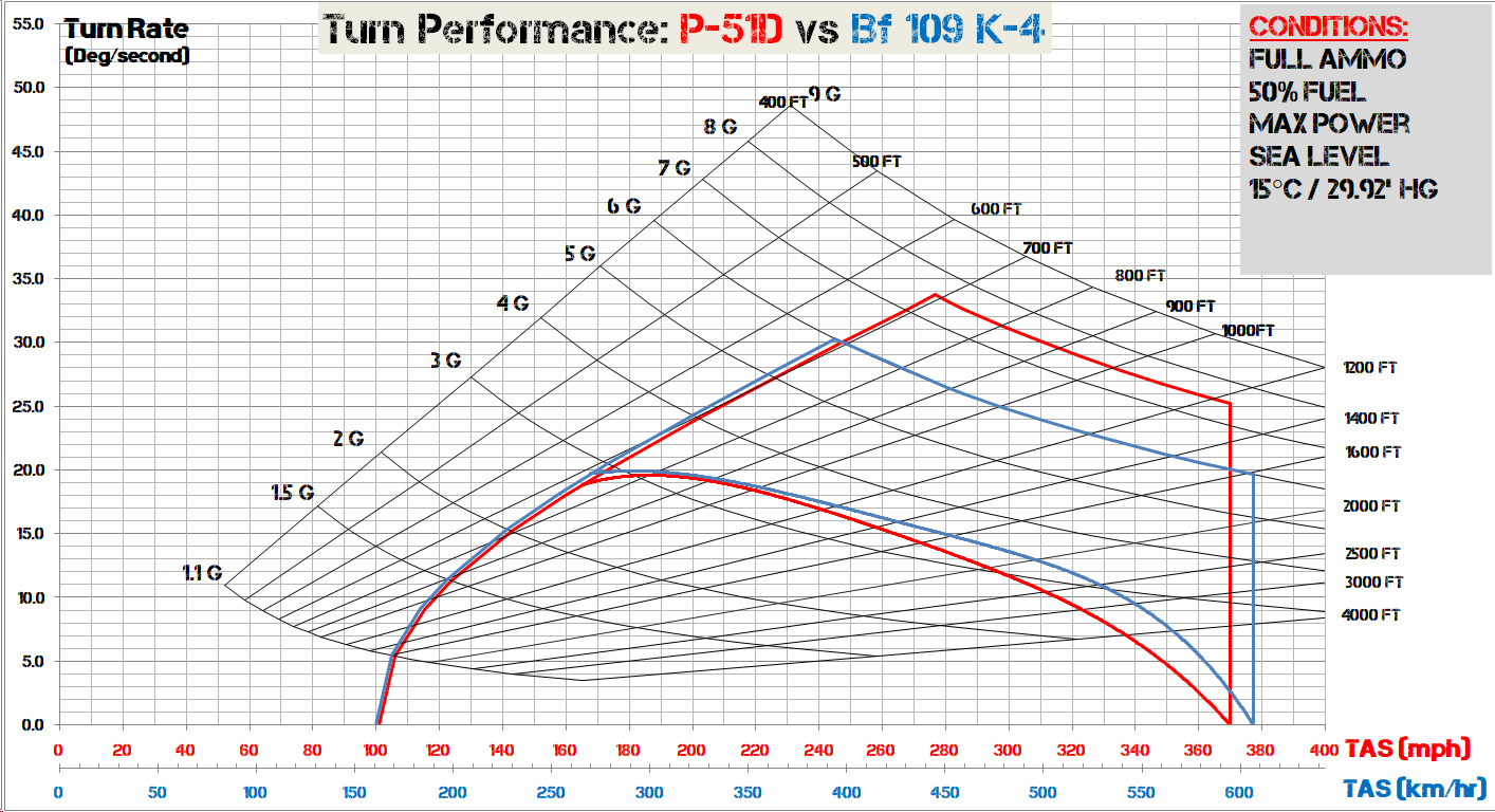 JtD Posted May 14, 2021 Posted May 14, 2021 Having spend a good portion of yesterday turning the 109K and the P-51 at sea level, I've come to the conclusion that their performance matches pretty well with what the first to charts YakPanther posted here show. I've got slightly different performance, but this is explained with a slightly different fuel load. I also got better turns out of the P-51 than I initially got, which makes the gap between the two smaller than expected. Anyway, point to make is that the Bf109K-4 doesn't really perform a lot different between say 280 and 310, and since flying it at the minimum edge of that range is quite hard already, I suppose if you really do a sustained turn fight in one, you won't be flying it directly at the lift limit. It's hard to fly a mostly stalled aircraft, even in Il-2, and I'm guessing those who do and lose, aren't really complaining about the sustained turn performance. Which leads us to a few more observations on relative performance. One - the P-51 is really fast, even down low. This means it has a lot of speed to bleed in the not sustained part of the fight. Two - the P-51 is quite heavy, which means it carries more energy than a Bf109K at the same speed and altitude. Three - the P-51 is aerodynamically extremely clean, which means it does not bleed speed and energy as quickly as a Bf109K. Four - the P-51 comes with a g-suit, and entering a turning contest at medium to high speed, blackout is bothering me quite a bit. Five - subjectively, I find the P-51 easier to fly smoothly, saving energy and getting closes to the limit. All these points add up to the result that if I started at medium or higher speeds or maybe not at sea level altitude, in a P-51D I'd always effectively outturn me in a Bf109K way before sustained turn performance truly starts to matter. The only way to counter this would be to keep climbing in the 109K (spiral climb), but doing this comes with its own set of risks. 4
