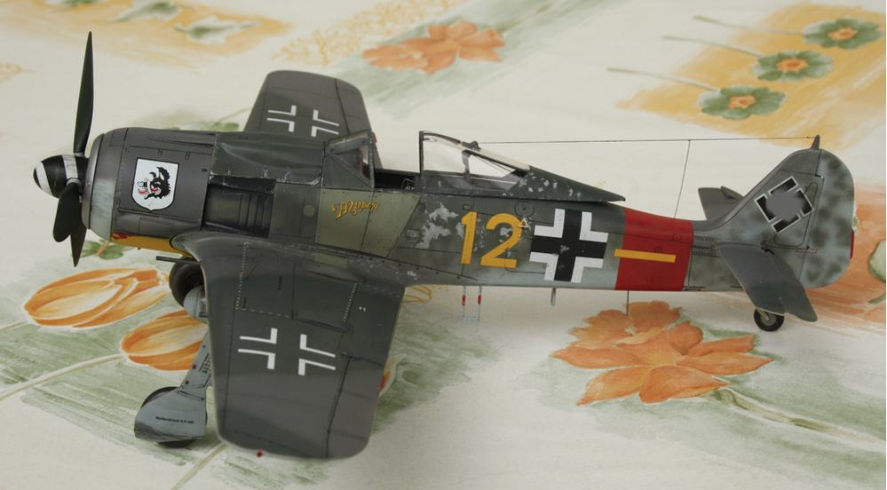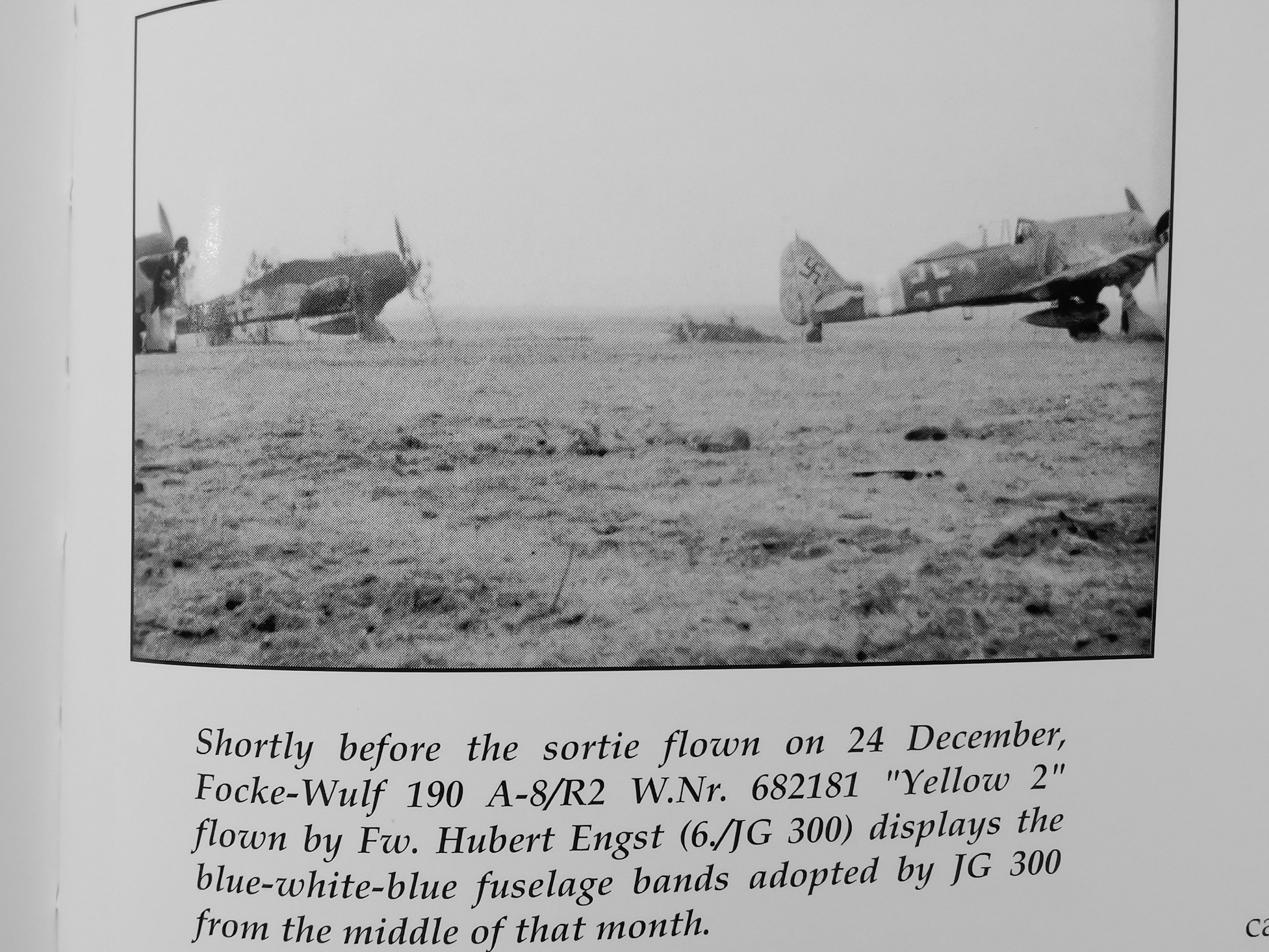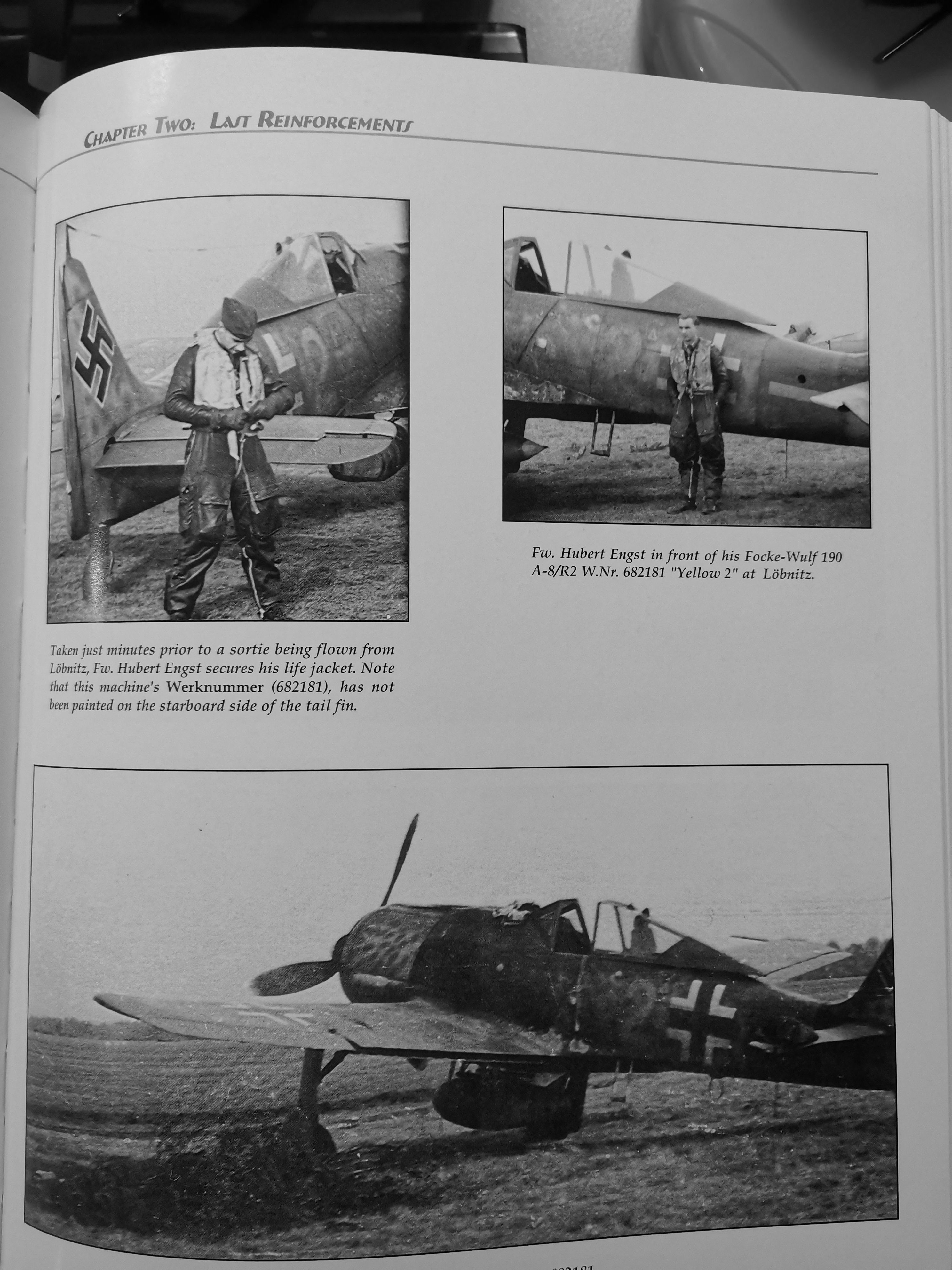 SR603-Flowbee Posted March 3, 2021 Author Posted March 3, 2021 (edited) 2 hours ago, RaFiGer said: @Flowbee You're weathering is fantastic and looks really good, but historical the planes mostly was in better shape as you present them. German's are curios, because even near the end you find planes that was painted quite good and provisorical paint eg. and the additional paint armour using primer was common with the field units. If you go historical with later FW-190 models use the right marking on the wings (white outline cross) and comouflage in RLM standart. I have a lot of good books covering the JG in the Reichsverteidigung togehter with nearly all available ld and new painting guides , so additional paint on field was applied over standart camouflage Thank anyways for these interpretation, they are look awful good The photo showed the plane with the former red RVB as you can see in my attached scan: Reveal hidden contents Thanks for the pics as they clarify the band in the black and white photo. However the author has also made a mistake so I'm not alone. The red RV band belongs to 5./JG300. And the W.Nr. is wrong? In June 1944, Engst was transferred to 6./JG 300. On 24 August 1944, he attacked a formation of USAAF B-24 four-engine bombers over the Neuhaus region (Jindrichuv Hradec area) of Bohemia. Engst shot down one B-24 to record his sixth victory, but his Fw 190 A-8 (W.Nr. 681 361) “Yellow 7” was damaged by return fire and he was badly wounded. On 24 December, Engst was shot-down and wounded in aerial combat near Hersfeld whilst flying Fw 190 A-8 (W.Nr. 682 181) “Yellow 2”. To be honest I'm more interested in making interesting looking aircraft than checking numbers so thanks for the photos which give another version of the camo pattern. Actually I'm still confused with regards to the red band as in b/w the band would look almost black which it clearly does not. It looks like over painted yellow or white? Edited March 3, 2021 by SR603-Flowbee 1