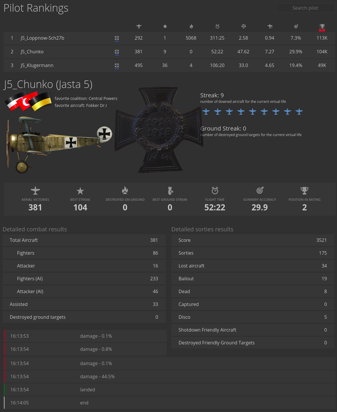 JGr2/J5_Baeumer Posted March 3, 2021 Posted March 3, 2021 (edited) It is with heavy hearts that the pilots of Jagdstaffel 5 inform the community that Chunko has fought his last fight here. Having won many fights over Flanders with so many of you whom he considered worthy opponents, and having won his fight with cancer a handful of years ago, and untold other fights that life brings that only he knew, he has flown his last flight here. Yesterday I received word from another community member who knew him in person and had attended various flight shows with him (and also flew with him before J5) that he passed away last week from a "chest infection". Although we are not sure, it appears from what we know that either he had a adverse reaction to his vaccination just a handful of days prior to his feeling ill or that he had unknowingly contracted COVID prior to receiving his shot and before it could protect him from this scourge, which takes a few weeks after getting it. Chunko had been a long-time pilot with Jasta 5 since 2012 in the days of RoF and had become respected in the WWI community as one of the best pilots in the air and on the ground. He was instrumental in the training of several cohorts of Greentails at Boistrancourt over the years and he had continued that role in Flying Circus (once we all convinced him to come over to it!). He was always willing to share what he knew with other pilots and he was one of the deadliest shots over the front. He had recently earned his Pour le Merite and shortly thereafter, his Bavarian Military Merit Cross, 3rd Class for 40 scores in a single virtual life. He will be missed by all who knew him. Those who knew and flew with Chunko understood that to fly with him meant soaring to great heights above everyone else, to gain the edge of altitude and surprise. Now unconstrained by material and gravity, he is free to soar to the greatest heights ever possible to receive his final reward that is not earned and only given above... Those who would like to attend a missing wingman formation flown by Jasta 5 in his memory are welcome to do so this Saturday at 1700 GMT (convert to your local time) on a server titled Chunko Memorial. Below are a few video tributes from fellow pilots of Jasta 5: Mueller Tribute using music from the band he played in: Daedallus Tribute: Memorial Flight... Edited March 9, 2021 by J5_Baeumer video tributes added 35